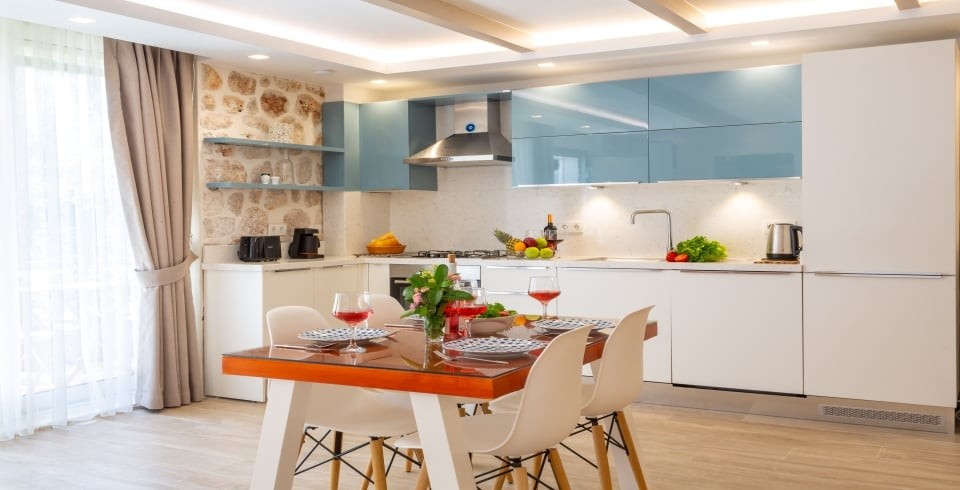 Mutfak : Tam donanımlı ankastre mutfakta elektrikli fırın, ocak, buzdolabı, bulaşık makinası, davlumbaz, kahve makinası, tost makinası, kettle bulunur. Mutfakta yemek yapılabilmesi için gerekli her türlü araç gereç mevcuttur.