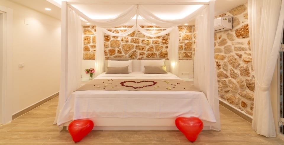 1. Yatak Odası : Ebeveyn/Balayı odası balayı konseptiyle dekore edilmiştir ve bahçe manzaralıdır. Odada büyük boy çift kişilik cibinlikli yatak, çift kişilik jakuzi ve televizyon bulunmaktadır.