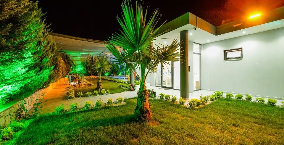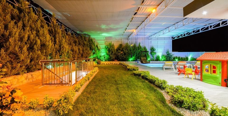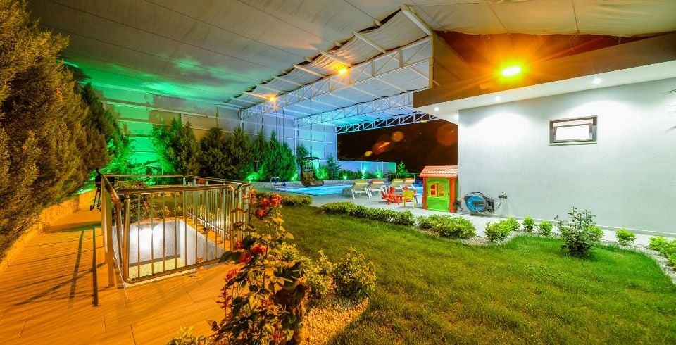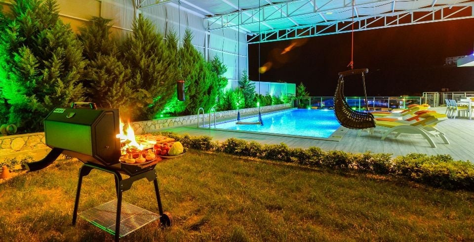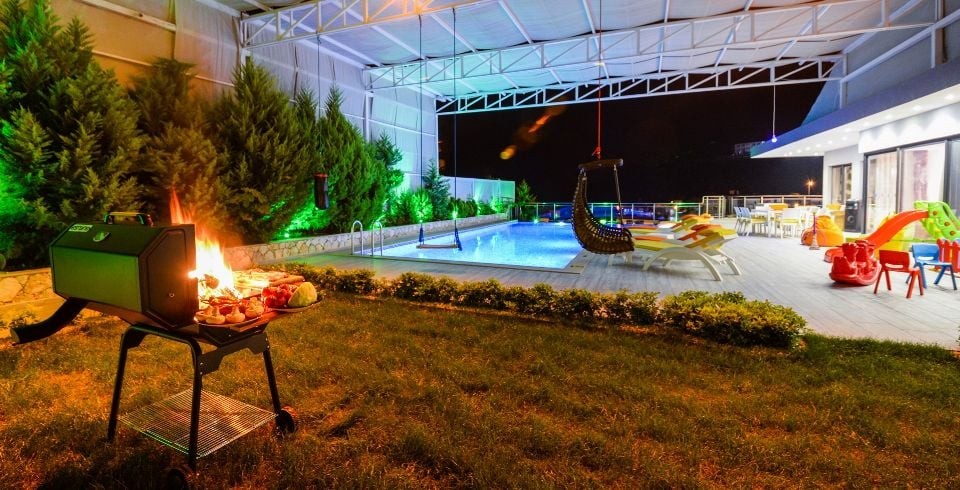 Bahçe : Villamızın bahçesinde özel yüzme havuzu, güneşlenmeniz için 6 adet şezlong, güneşlenme terası, 6 kişilik masa, oturma grubu, mangal keyfiniz için barbekü, güneş şemsiyesi bulunmaktadır. Villamızın bahçesinde masa tenisi ve langırt vardır.