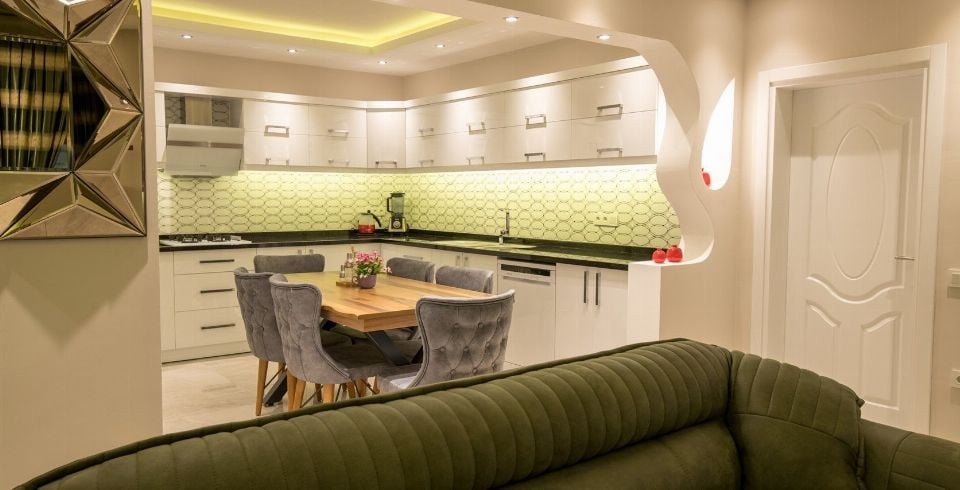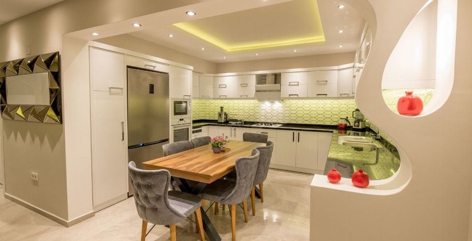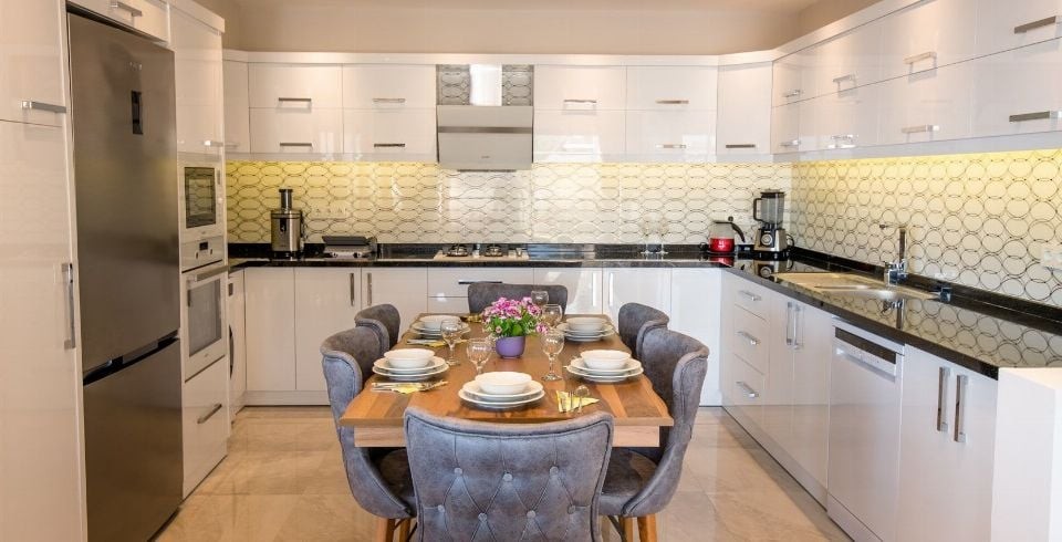 Mutfak : Villamızın geniş Amerikan mutfağı ile sizlere kendi evinizin mutfağı gibi hissettirecek. Ayrıca mutfakta bulaşık makinası, buzdolabı, çamaşır makinası, mikrodalga fırın, ekmek kızartma, su ısıtıcısı, fırın, 4`lü ocak seti ve 6 kişilik yemek takımı ile tava tencere vb. mutfak araç gereçlerini kullanma fırsatı sizlere sunuyoruz.