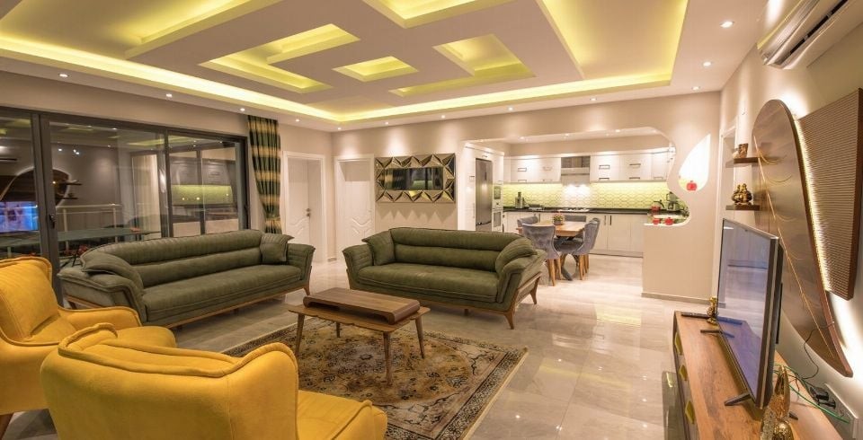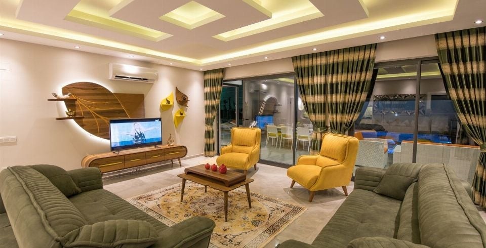 Salon : Villa Umaya’nın salonunda sizi şık bir oturma grubu ile klima, TV(LCD), DVD, internet, uydu, koltuk, sehpa ve 6 kişilik yemek masası ile ferah bir salon bekliyor olacaktır. Villamızın salonu eşsiz doğa ve mükemmel deniz manzarasını sizlere seyretmektedir.