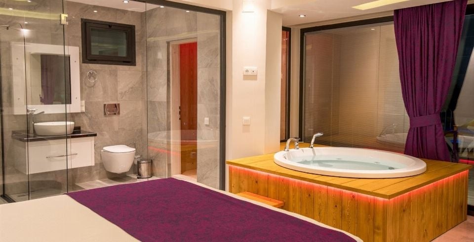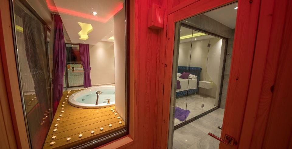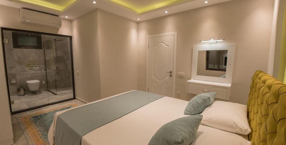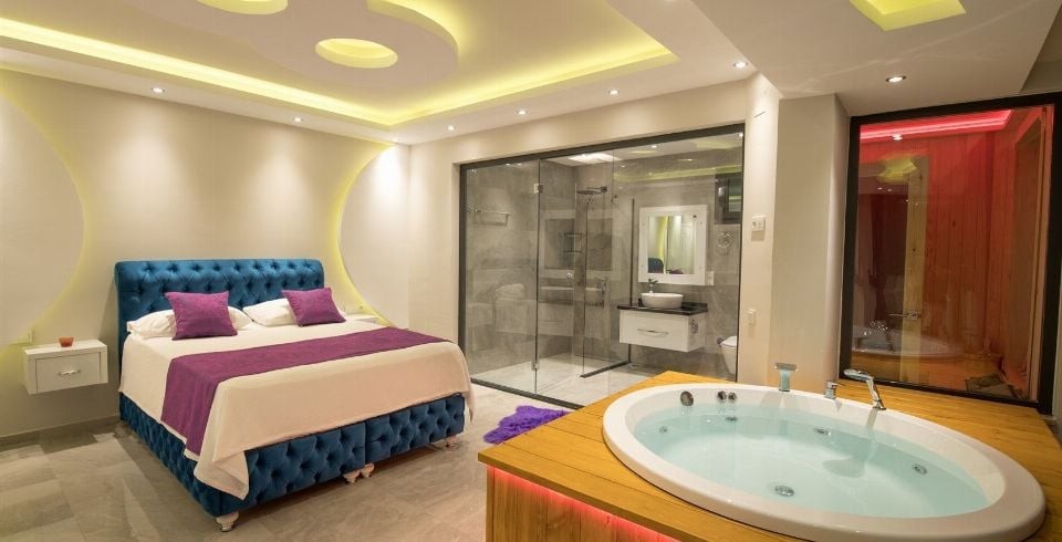 1. Yatak Odası : Süit yatak odamızda iki kişilik yatakla beraber sizleri sıcak yaz günlerinde serin tutması için bakımları yapılmış klima ile komodin eşyalarınız için geniş elbise dolabı, makyaj masası, saç kurutma makinası, banyo ve lavabodan oluşmaktadır. Bu odamızda jakuzi keyfi ve sauna ile lüks bir tatil seçeneği var.