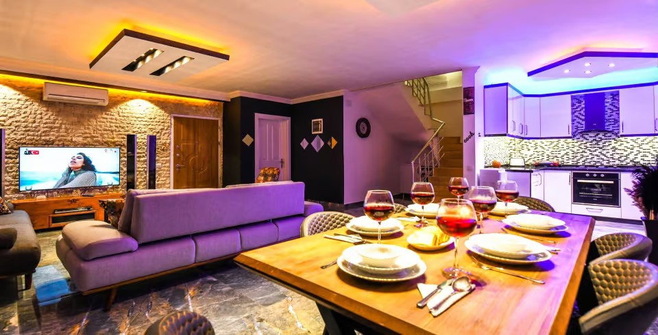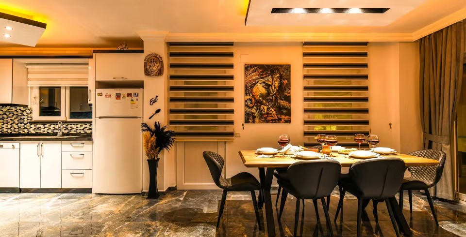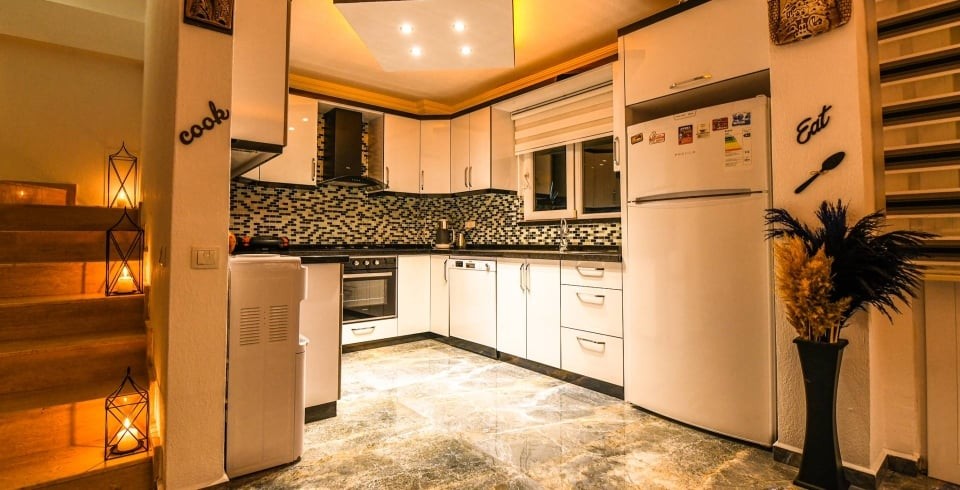 Mutfak: Amerikan açık mutfak Buzdolabı, Bulaşık makinesi, Çamaşır makinesi, Fırın, 4 ‘lü Ocak (ankastre), Mikrodalga fırın, Elektrikli su ısıtıcı, Ekmek kızartma makinesi, 8 kişilik yemek takımı, Tava, Tencereler, Çatal bıçak vb.