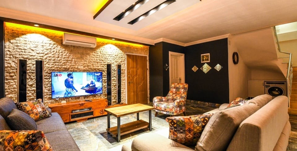 Salon: Kullanışlı ve hoş görünümlü salonumuzda Oturma grubu, Uydu TV (LCD), Klima, Şömine, 8 kişilik yemek masası, Havuz kenarına çıkış, WC Lavabo bulunmaktadır.