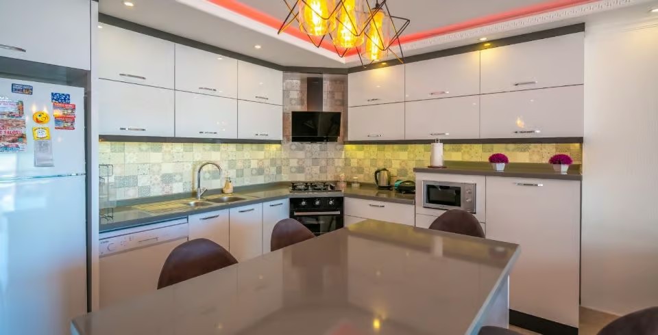 Mutfak : Açık Amerikan mutfaktır. Mikrodalga fırın, tost makinesi, sıcak su ısıtıcısı (kettle), fırın, dörtlü ocak, davlumbaz, bulaşık makinesi, çamaşır makinesi, çatal, kaşık, bıçak, tavalar vb. yer almaktadır.