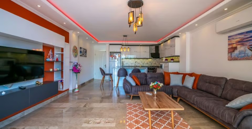 Salon : Modern oturma grubu, televizyon, uydu alıcısı, yemek masası ve sandalyeler, kablosuz modem, klima vb. yer almakta, ayrıca havuz terasına çıkış bulunmaktadır.