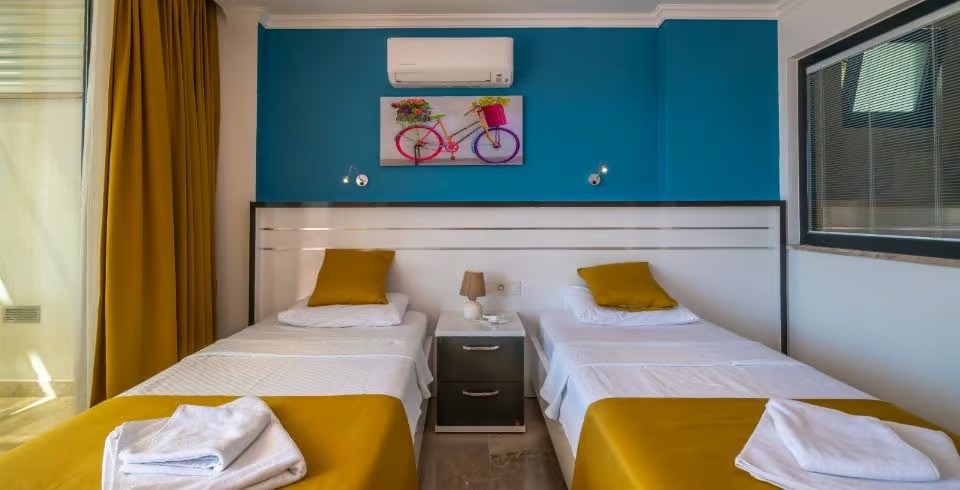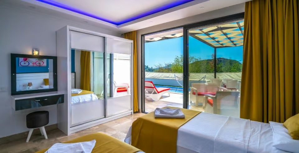 Yatak odası 2 : Genç yatak odasıdır. 2 adet tane tek kişilik yatak, komodin, TV , elbise dolabı, klima bulunmaktadır. Havuz terasına çıkış vardır.