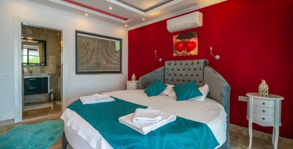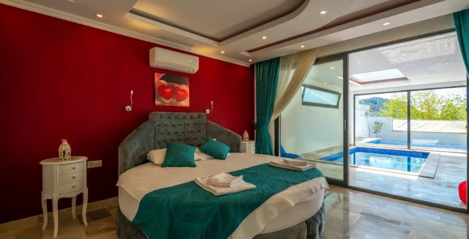 Yatak odası 1 : Master suit yatak odasıdır. 1 adet yuvarlak çift kişilik yatak, 2 adet komodin, makyaj masası, klima, banyo ve tuvalet, ısıtmalı havuz bulunmaktadır.