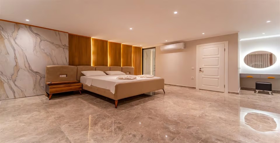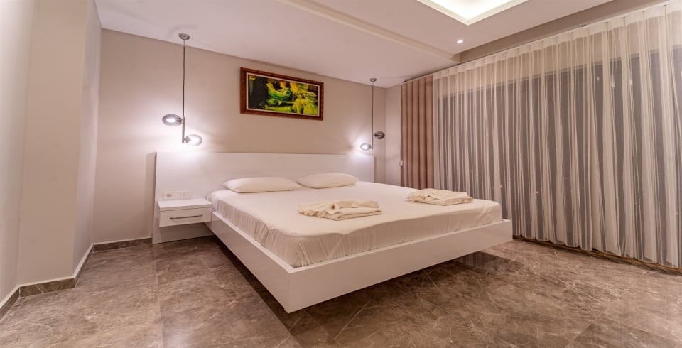 2. Yatak Odası : Çift kişilik süit yatak, klima, elbise dolabı, komodin, makyaj masası, banyo ve lavabo bulunmaktadır.