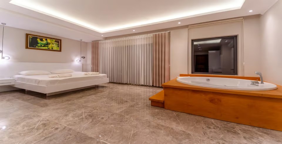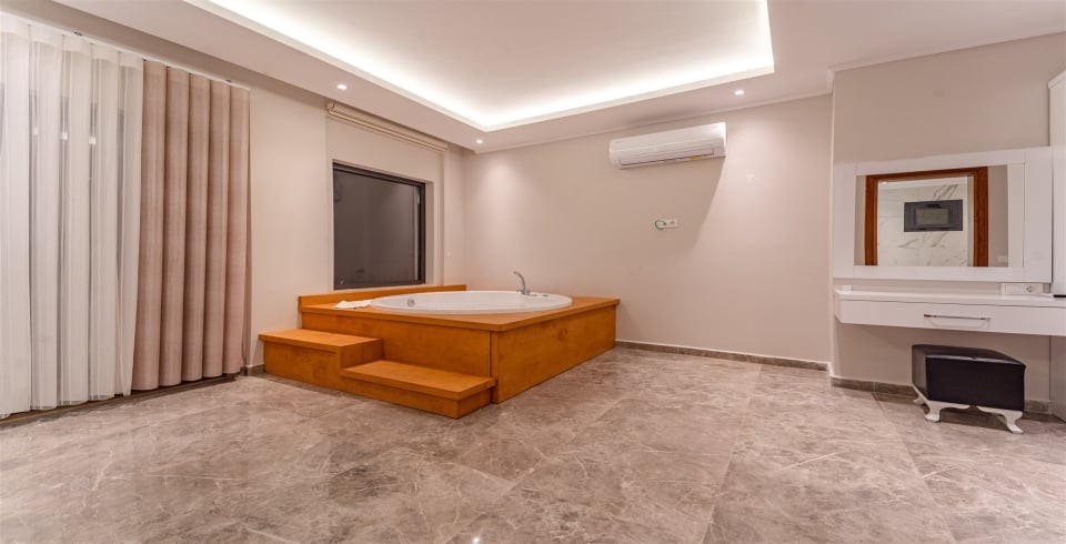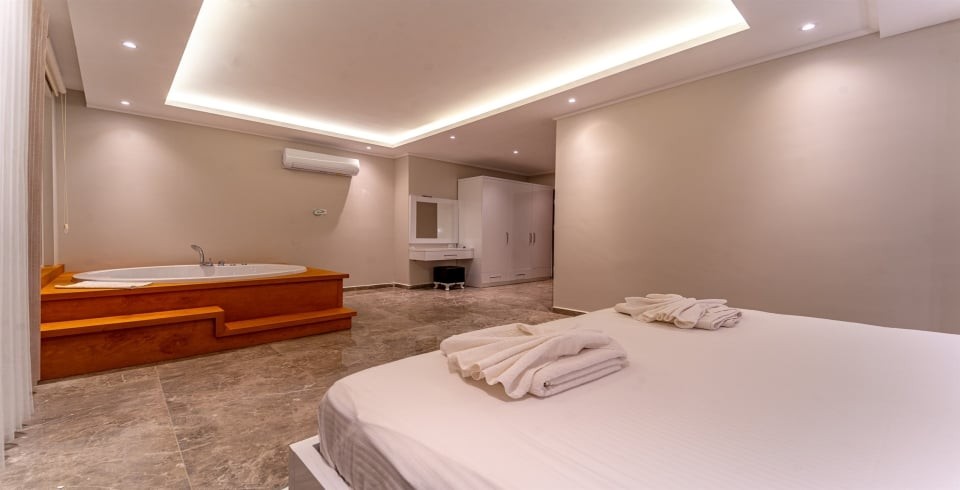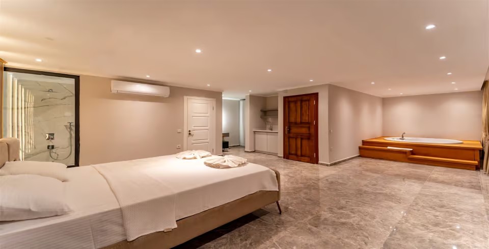 1. Yatak Odası : Çift kişilik süit yatak, klima, elbise dolabı, komodin, makyaj masası, jakuzi, banyo ve lavabo bulunmaktadır.