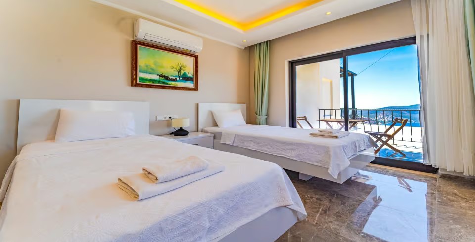 3. Yatak Odası : 2 adet tek kişilik yatak, klima, elbise dolabı, makyaj masası, komodin, banyo ve lavabo bulunmaktadır. Deniz ve doğa manzaralı balkon vardır.
