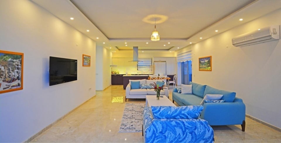 Salon :  Sizi şık bir oturma grubu ile klima, televizyon, internet, uydu, koltuk, sehpa ile ferah bir salon bekliyor olacaktır. Havuz terasına çıkış yapılmaktadır.