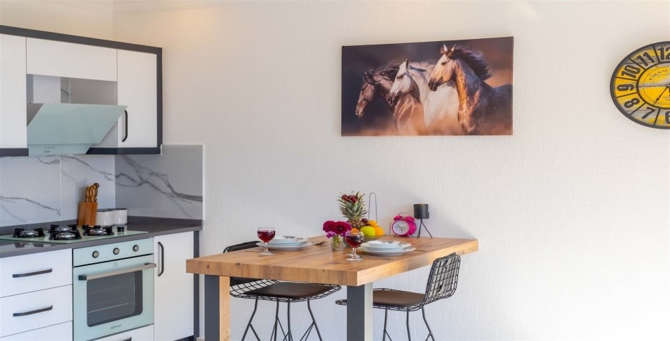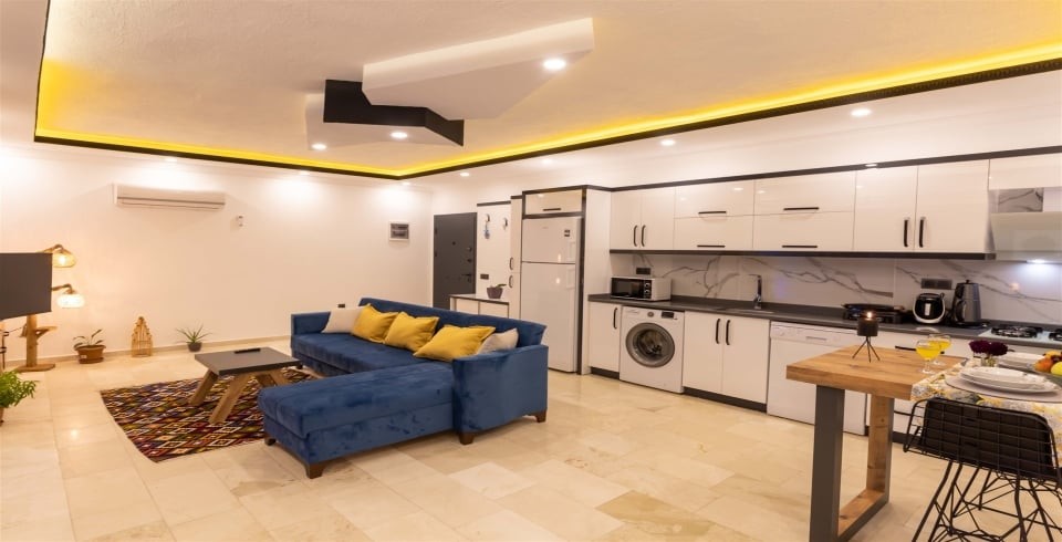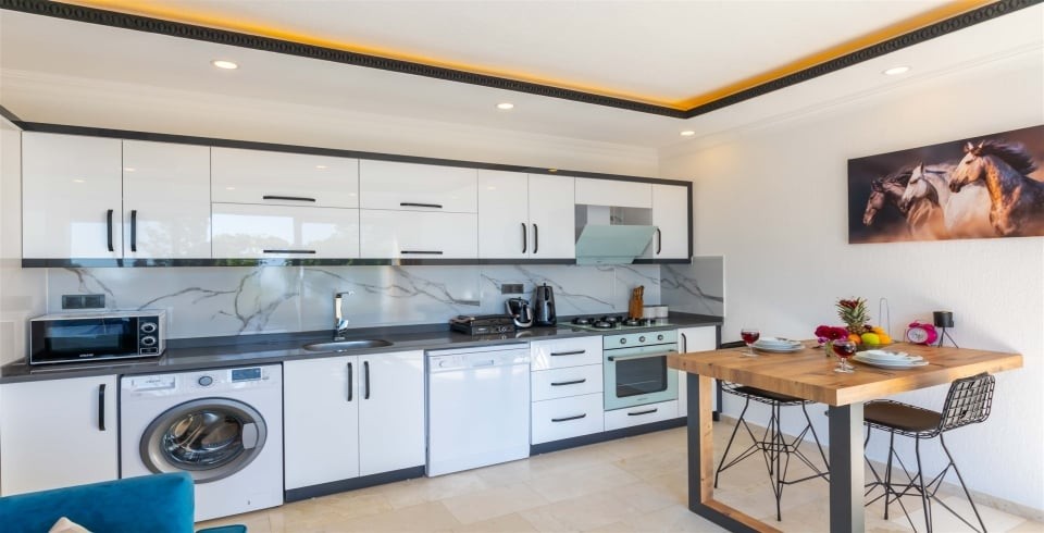 Mutfak :  Buzdolabı, çamaşır makinası, bulaşık makinası, 4 lü ocak ,mikrodalga fırın, kettle, çatal bıçak takımı, yemek takımı, fırın bulunmaktadır.