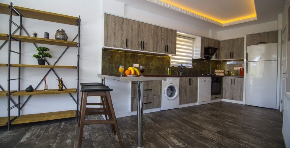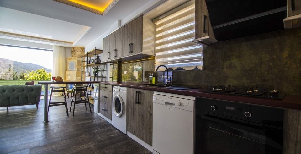 Mutfak: Amerikan mutfak içerisinde buzdolabı, bulaşık makinası, çamaşır makinası, yemek masası, mikrodalga fırın, 4’lü ocak, davlumbaz, fırın, elektrikli su ısıtıcı, yemek takımı, tava ve tencereler, çatal, bıçak takımı bulunmaktadır.