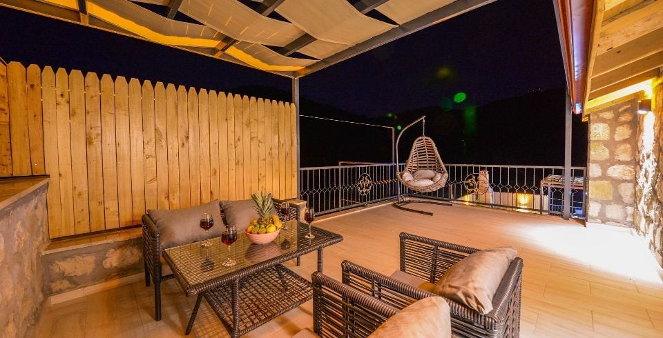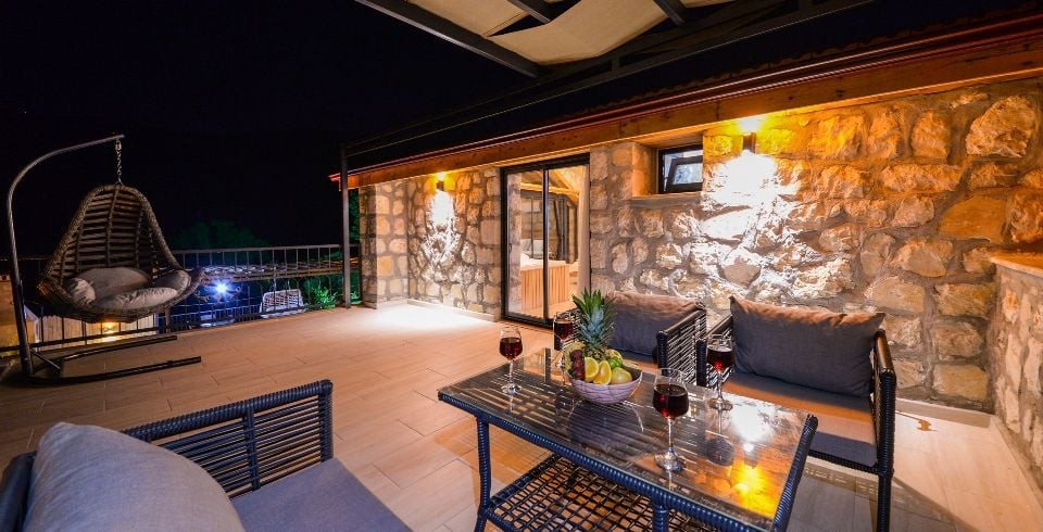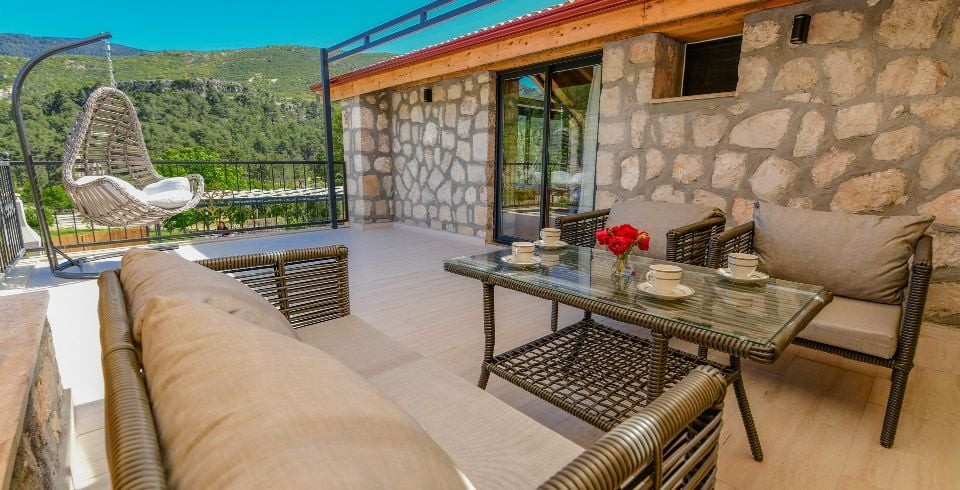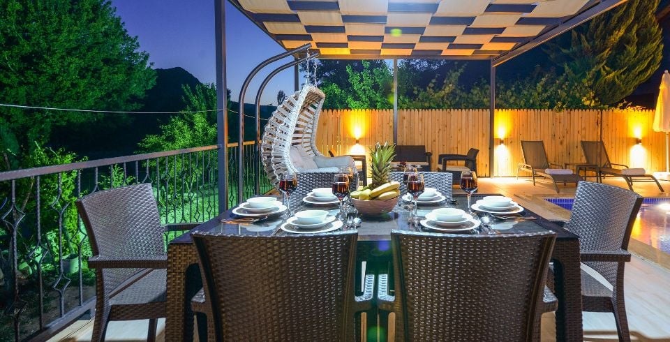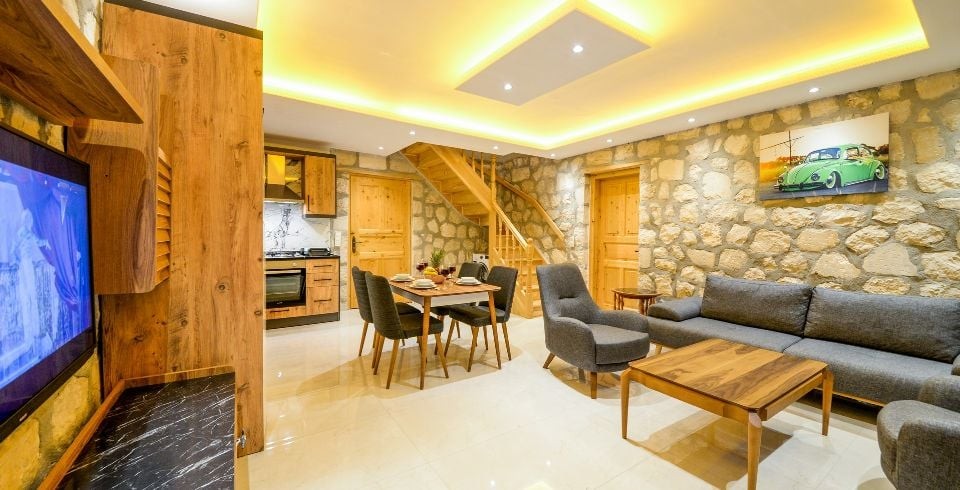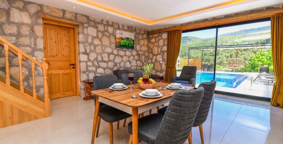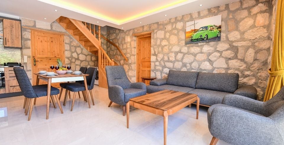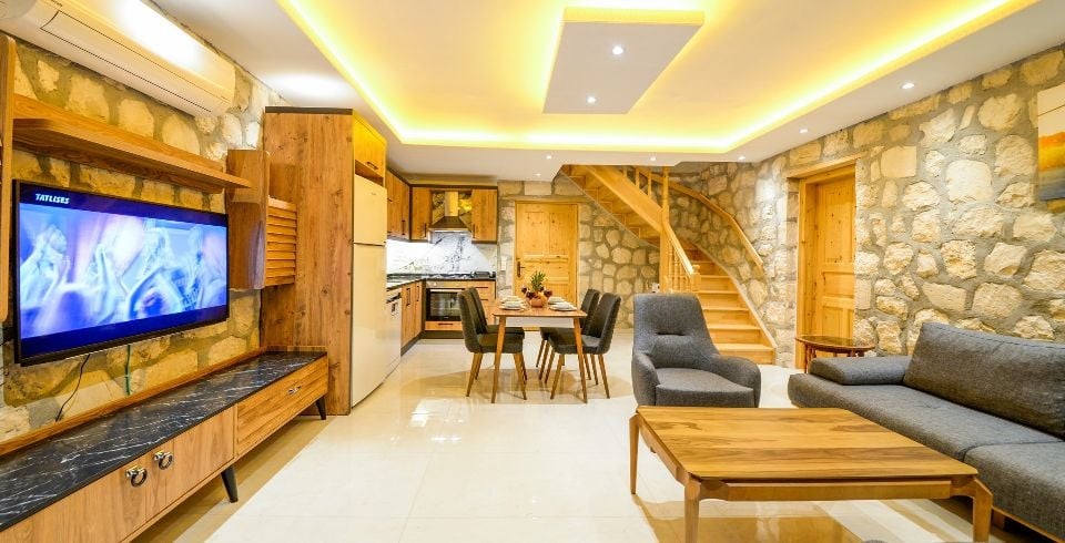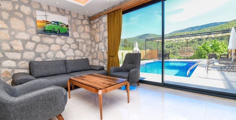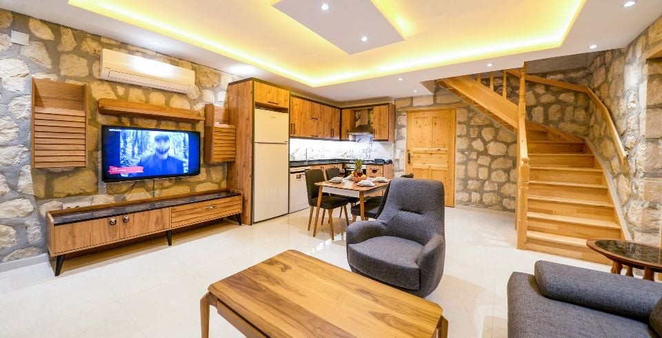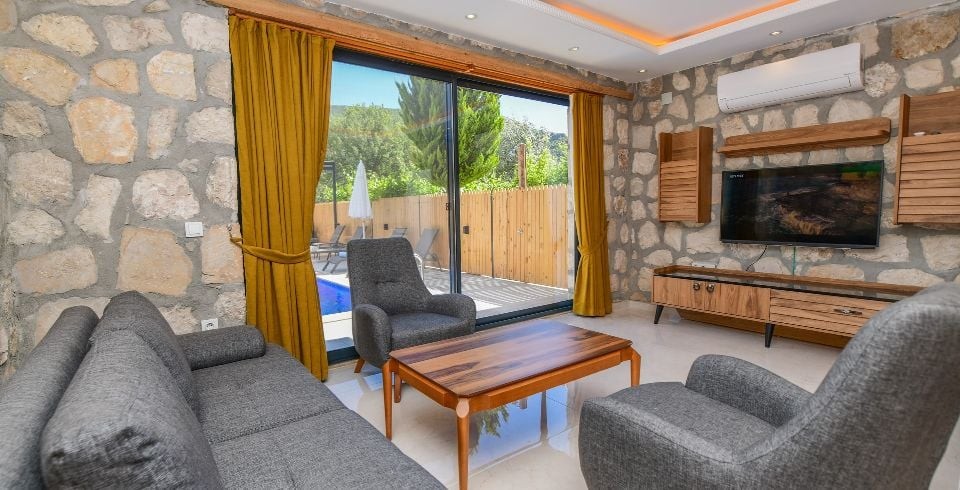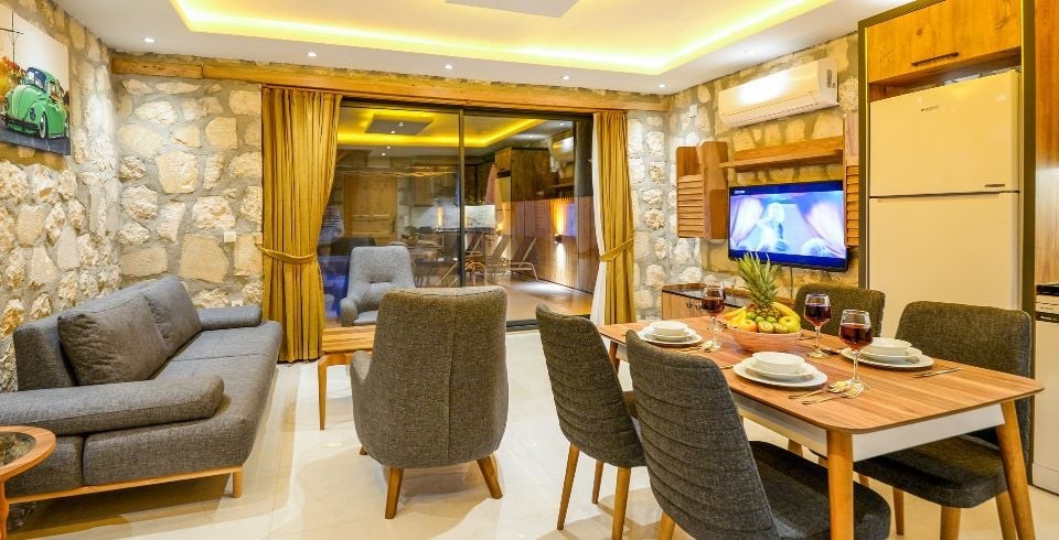 Salon : Villa Daffy salonunda konforlu oturma grubu, klima, TV, internet, uydu alıcı, yemek masası, sehpa bulunmaktadır.