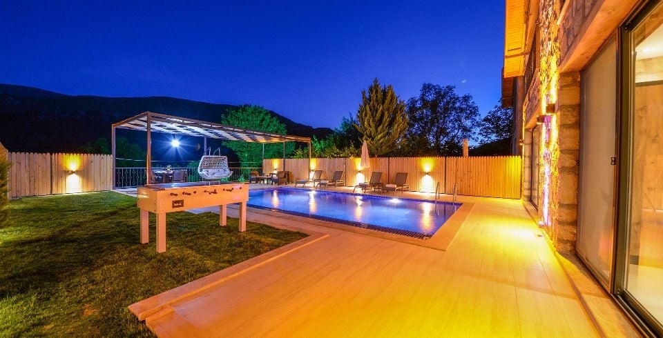 Havuz ve Bahçe : Havuz ve bahçesi korunaklı olup dışarıdan gözükmemektedir. Özel yüzme havuzu, şezlong, şemsiye, langırt, salıncak, yemek masası ve barbekü bulunmaktadır.