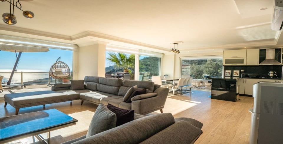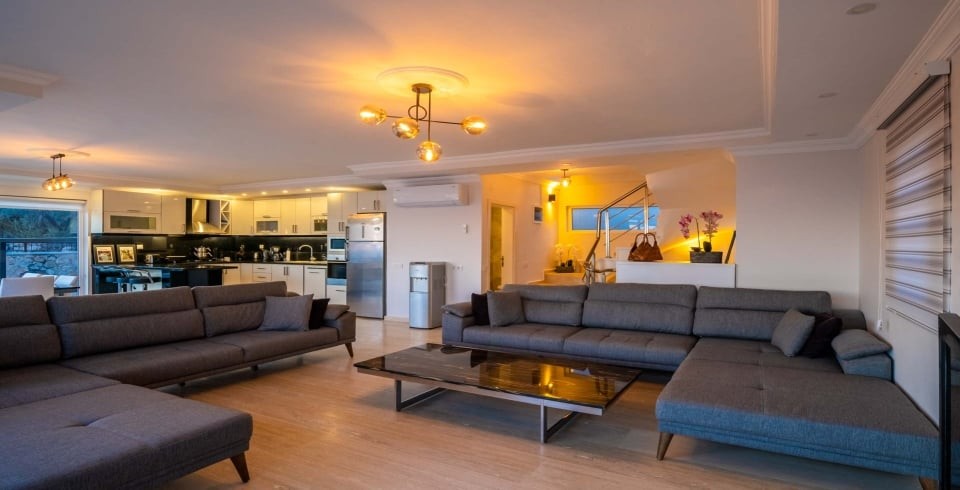 Villa in the Sky, geniş cam yüzeyleri sayesinde Kalkan Körfezi’nin kesintisiz manzarasını iç mekana taşıyor. Salon kısmında konforlu oturma alanları, büyük ekran TV, dijital platformlar ve şık dekorasyon detayları yer alıyor. Açık planlı modern mutfak; ankastre fırın, mikrodalga, geniş buzdolabı, kahve makinesi ve benzeri yüksek standartlı ekipmanlarla eksiksiz donatılmıştır. Uzun süreli konaklamalarda bile ev sıcaklığında ve konforunda zaman geçirebilirsiniz.