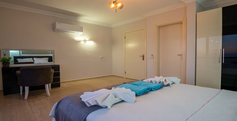 5. Yatak Odası: 1 adet çift kişilik yatak, TV, elbise dolabı, makyaj masası, komodin, teras, jakuzi, klima ve banyo-WC bulunmaktadır.