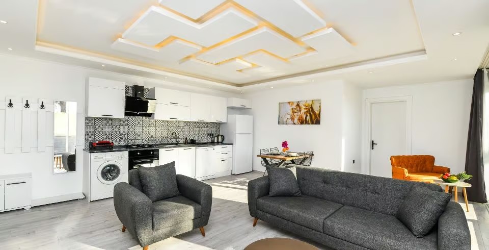 Mutfak :  Amerikan mutfak, buzdolabı, bulaşık makinesi, 4´lü ocak, yemek masası ve sandalyeleri, mutfak araç ve gereçleri bulunur.