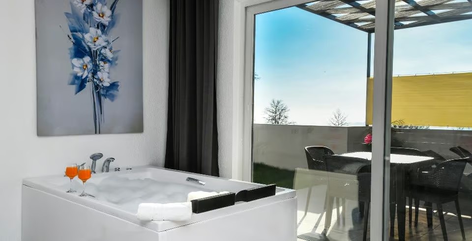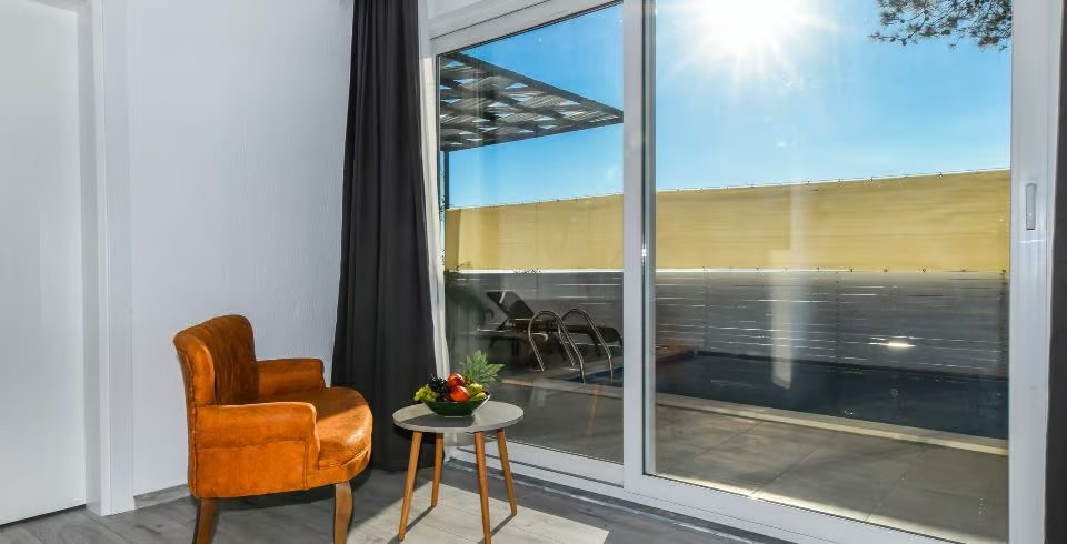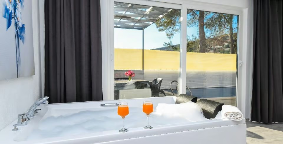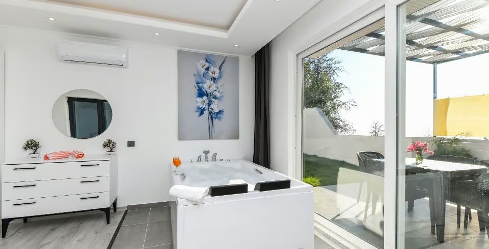 1. Yatak Odası : Suit yatak odası 1 adet çift kişilik yatak, klima, jakuzi, gardırop, komodin, yer almaktadır.