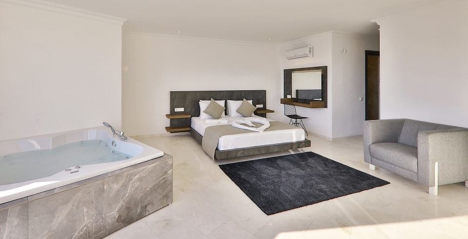 1. Yatak Odası: Süit aile yatak odası olup, 1 adet çift kişilik yatak, jakuzi, komodin, makyaj masası, elbise dolabı, klima, ve banyo tuvalet bulunmaktadır.