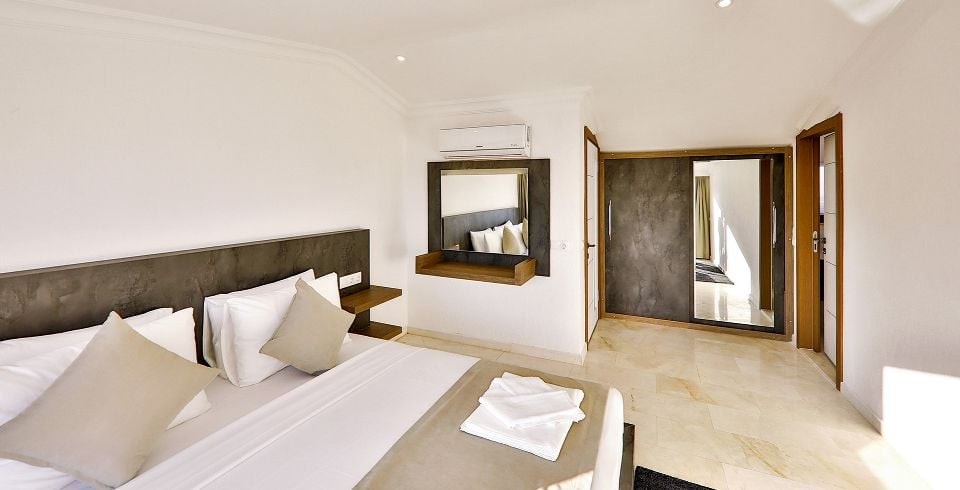 7. Yatak Odası: Süit aile yatak odası olup, 1 adet çift kişilik yatak, komodin, makyaj masası, elbise dolabı, klima, ve banyo tuvalet bulunmaktadır.