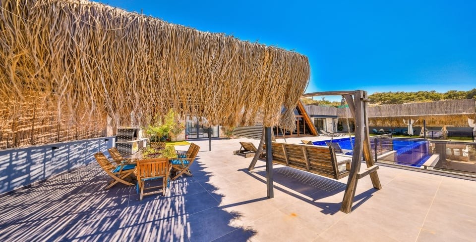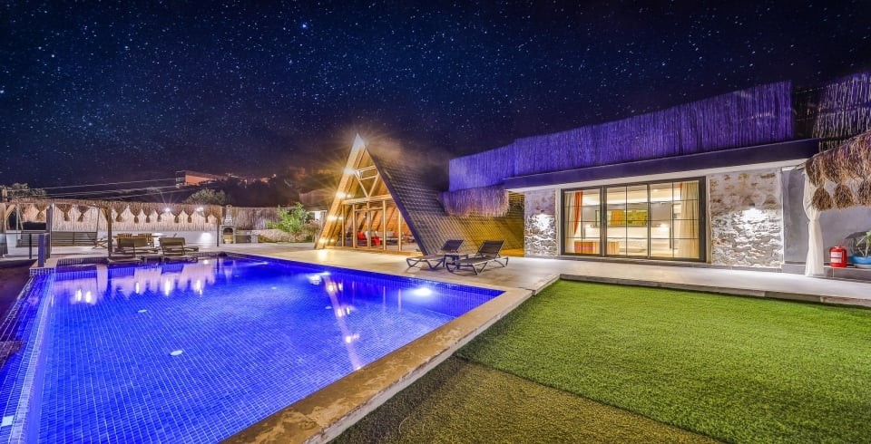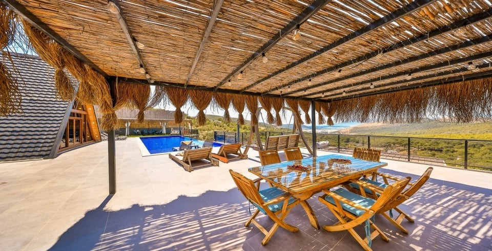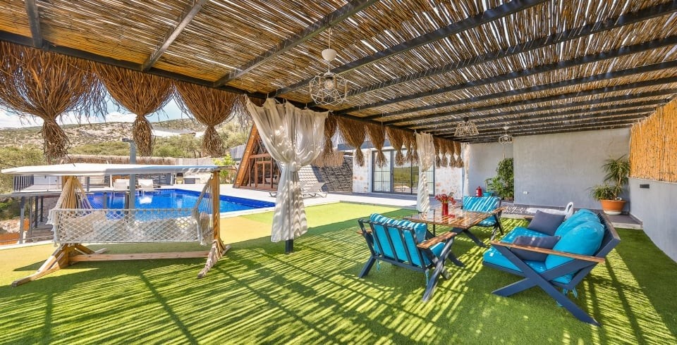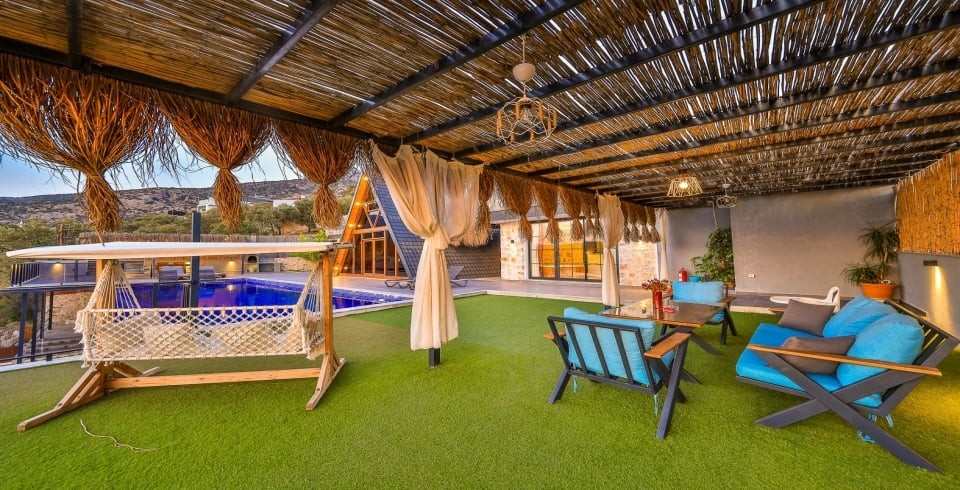 Salon : Modern ve lüks dizayna sahip salon içerisinde konforlu oturma grubu, TV, DVD oynatıcı, klima ve internet yer almaktadır. Salondan havuz terasına geçiş vardır.