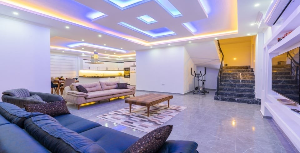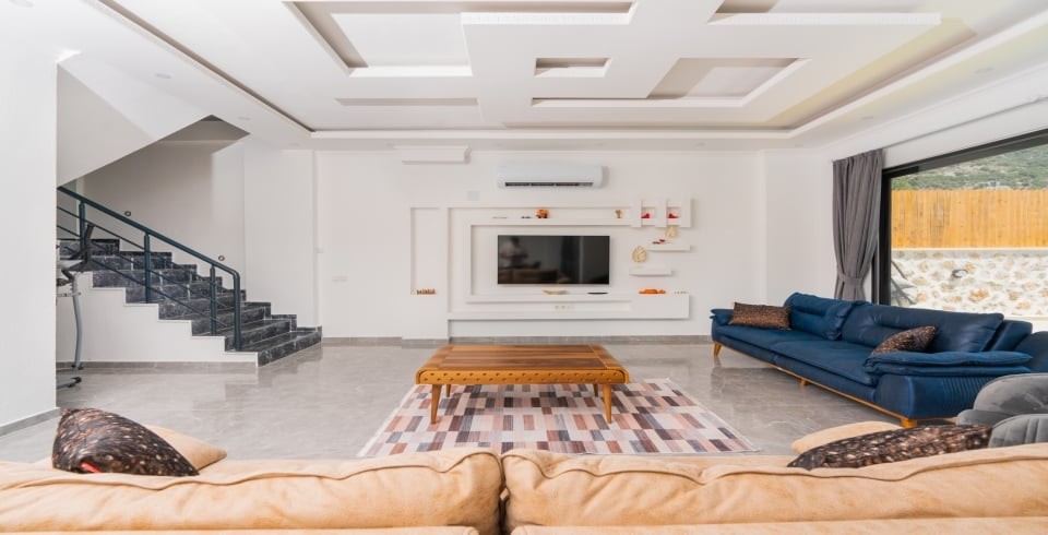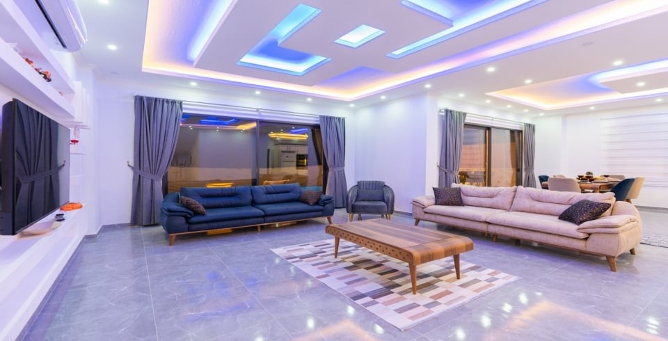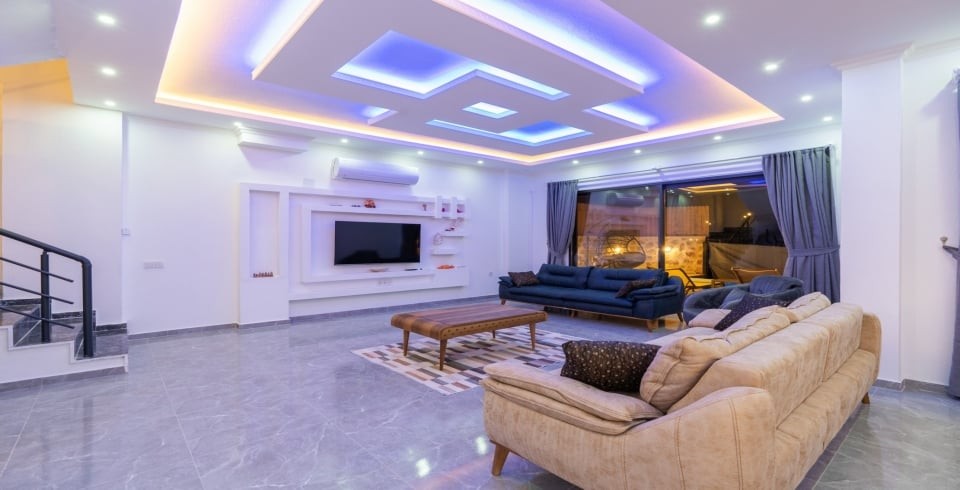 Salon: Villa salonunda konforlu oturma grubu, klima, TV, internet, uydu alıcı, yemek masası, sehpa bulunmaktadır.