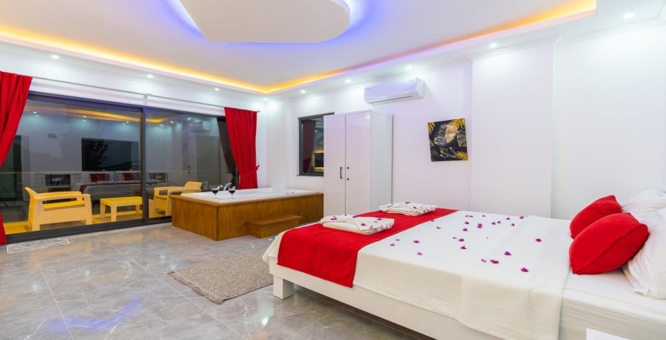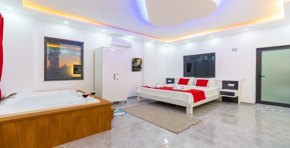 1. Yatak Odası: Çift kişilik yatak, klima, jakuzi, komodin, elbise dolabı, makyaj masası, banyo ve tuvalet bulunmaktadır.