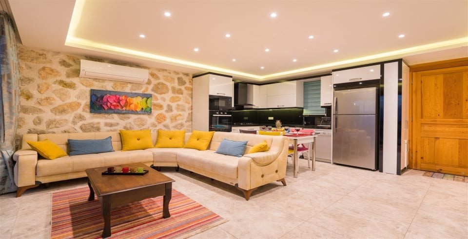 Salon : Oturma grubu, uydu, TV, DVD, klima, yemek masası bulunmaktadır. Ayrıca salondan havuz başına çıkış vardır.