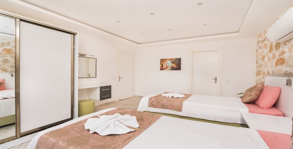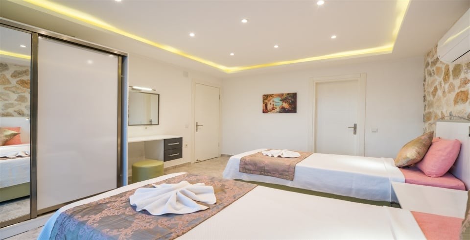 2. Yatak Odası : 2 adet tek kişilik yatak, elbise dolabı, komodin, makyaj masası, klima, banyo ve tuvalet bulunmaktadır.