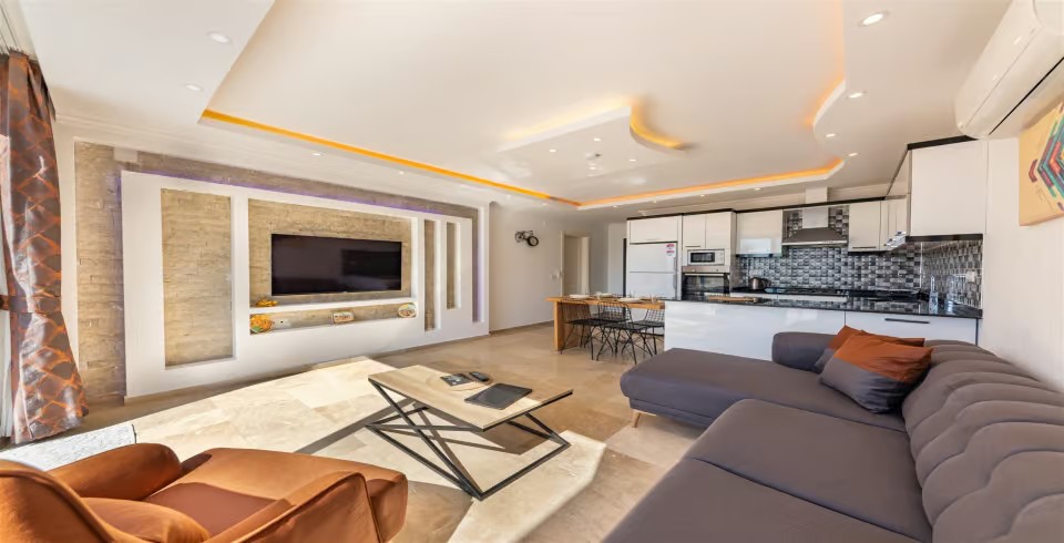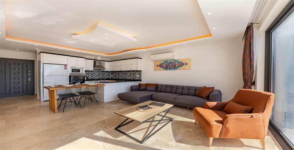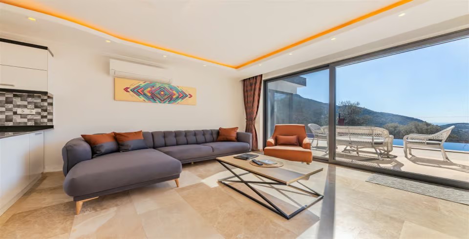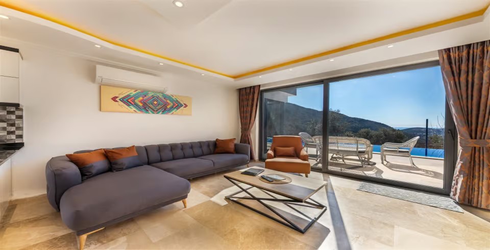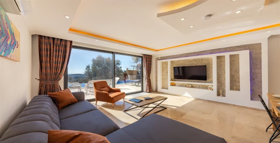Salon : Salon içerisinde oturma grubu, TV, klima, sehpa bulunmaktadır. Havuz terasına çıkış yapılabilmektedir.