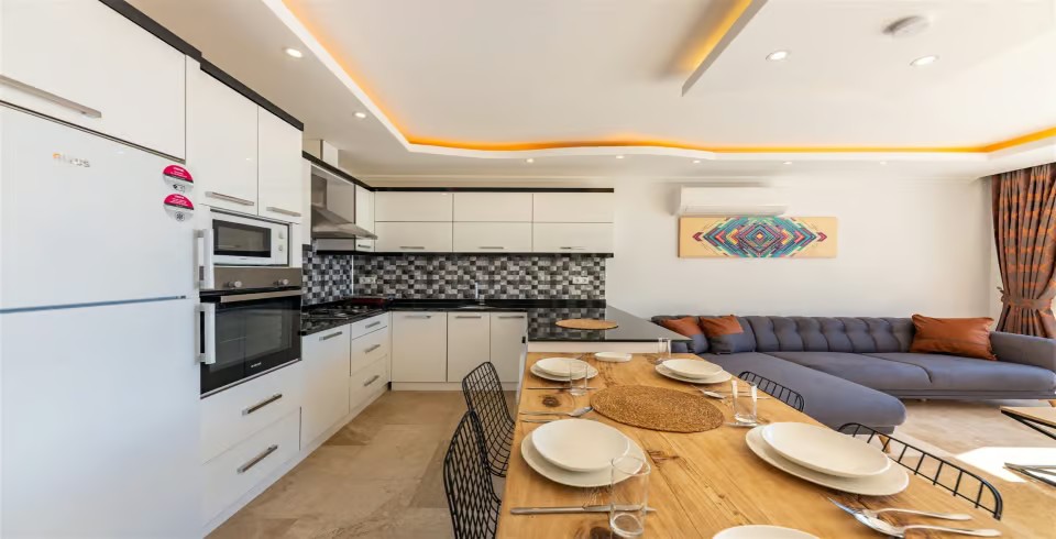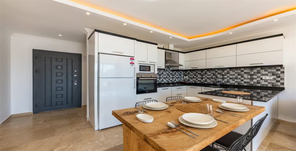 Mutfak : Modern Amerikan mutfak içerisinde buzdolabı, bulaşık makinası, fırın, ocak, mikrodalga fırın, tost makinası, yemek masası, yemek takımları, çatal ve bıçak takımları, tencere ve tava takımları, bardaklar bulunmaktadır.