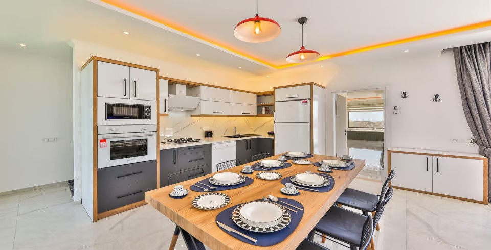 Mutfak : Villamızın mutfağına adımızı attığınızda kendinizi leziz yemekler yaparken bulabilirsiniz. Eksiksiz araç-gereçleriyle gözleri büyüleyen mutfağımızda buzdolabı, bulaşık makinesi, fırın, 4’lü ocak, mikrodalga fırın, elektrikli su ısıtıcısı, tost makinesi, 6 kişilik yemek masası, yemek takımları, çatal-bıçak takımları, tencere-tava takımları ve bardaklar bulunmaktadır.