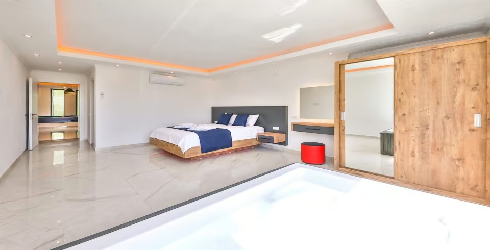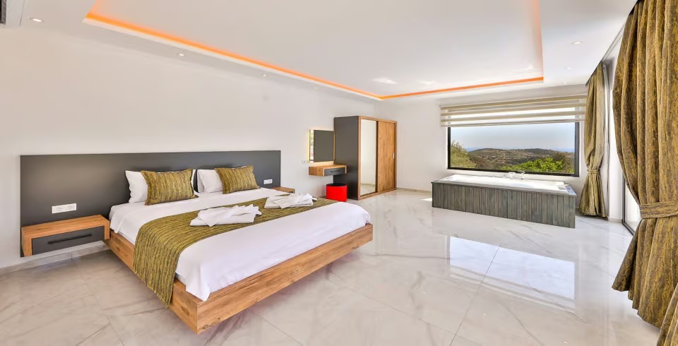 1. Yatak Odası : Çift kişilik yatak odamızda konforun tadını çıkarabileceğiniz, denize nazır, tüm yorgunluğunu giderebileceğiniz jakuzi bulunmaktadır. Klima, elbise dolabı, makyaj masası, tuvalet ve banyo bulunmaktadır.