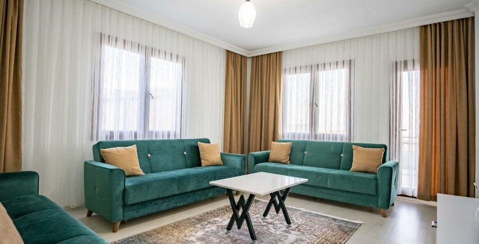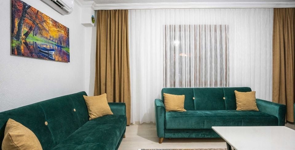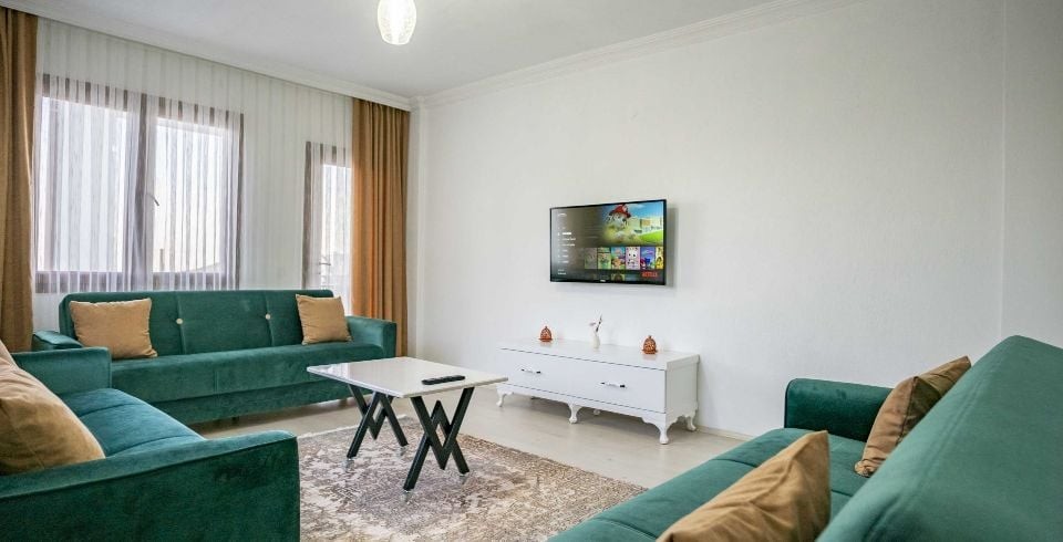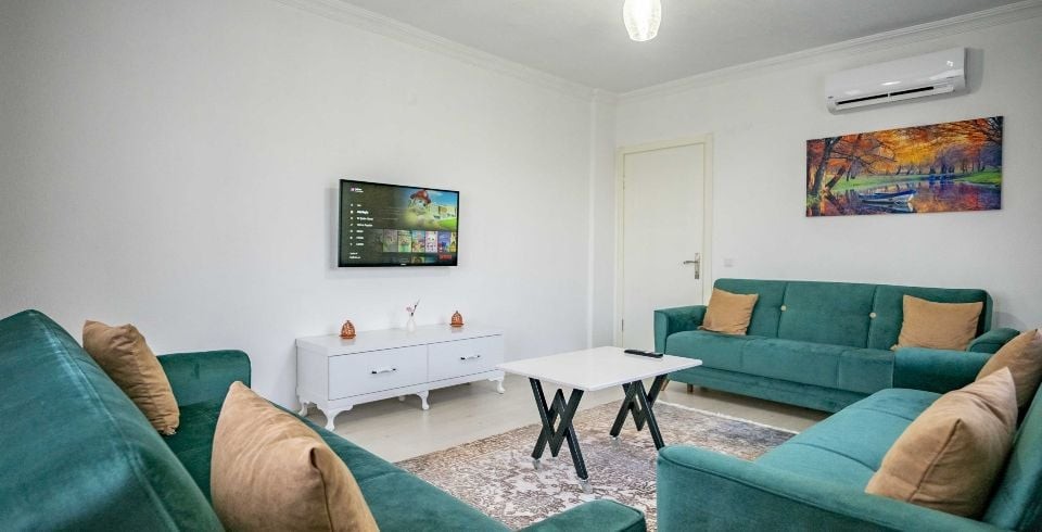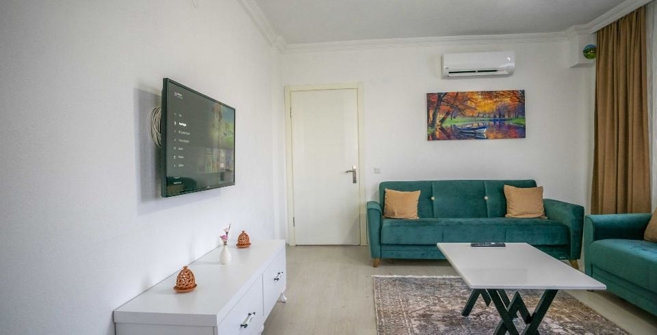 Salon: Kiralık villamızın geniş ve ferah görünümlü salon katında Oturma Grubu, TV, klima, sehpa ve dekorasyon malzemeleri bulunmaktadır.