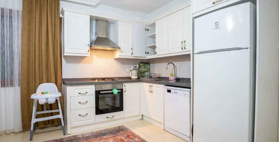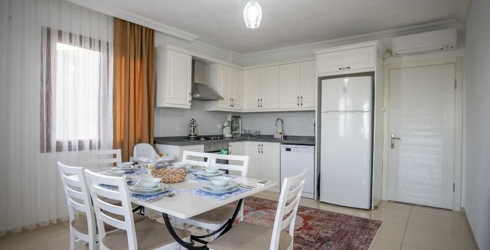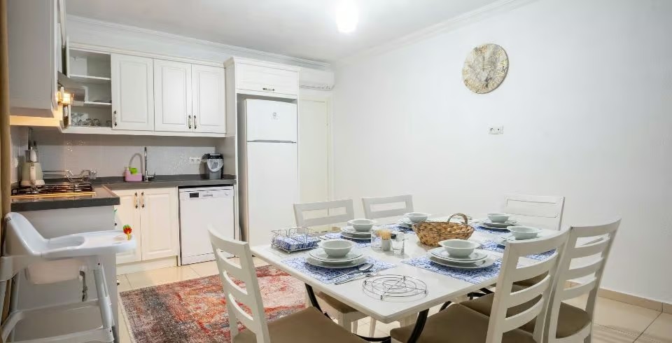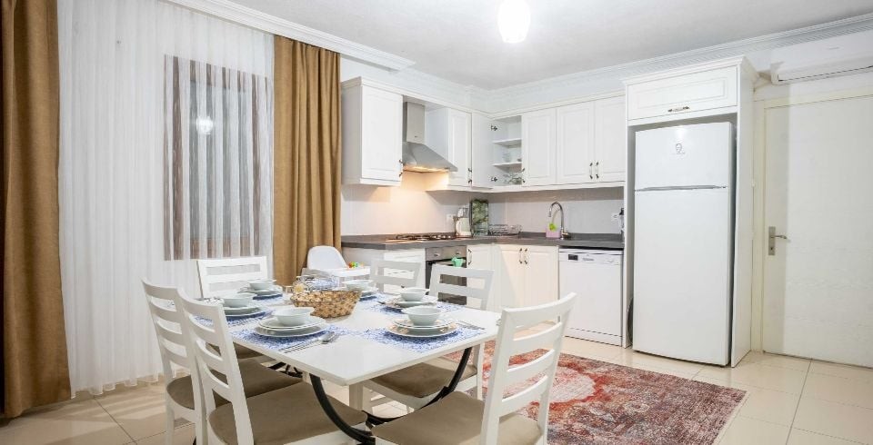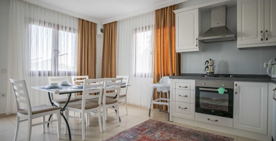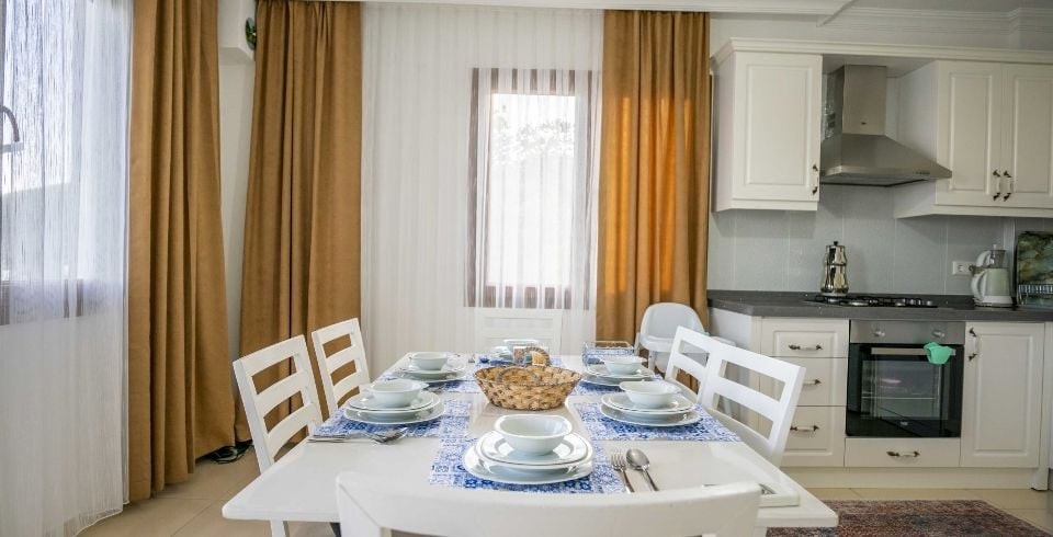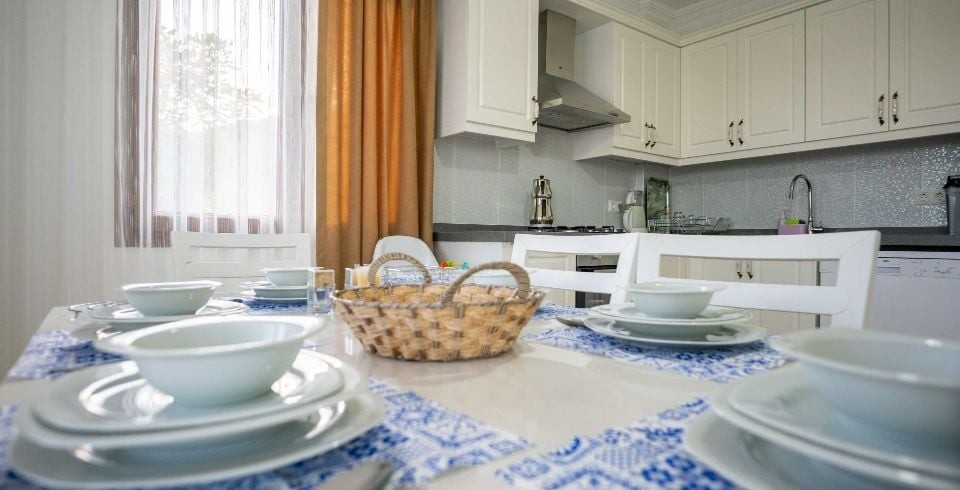 Mutfak: Villamızın modern Amerikan mutfağı içerisinde buzdolabı, çamaşır ve bulaşık makinesi, 4lü ocak, mikrodalga fırın, kettle, tost makinesi, yemek masası, yemek takımı, çatal bıçak takımı, tava ve tencereler bulunmaktadır.