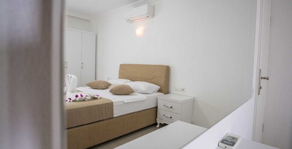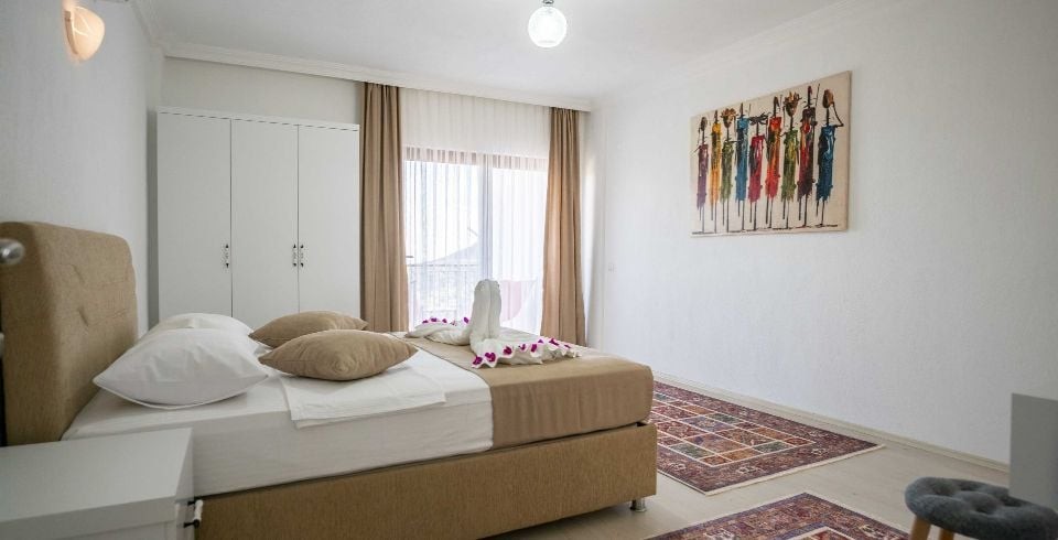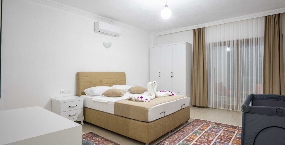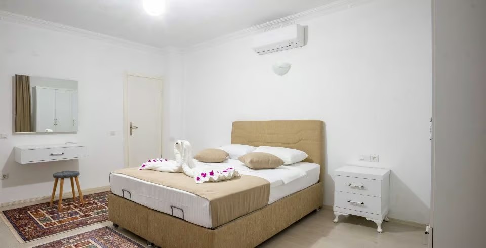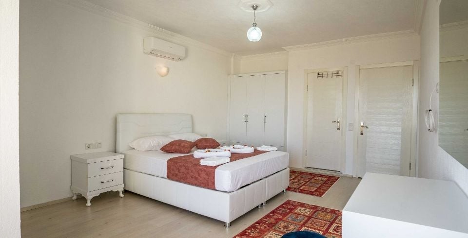 1. Yatak Odası: 1 Adet Çift Kişilik Yatak, Klima, Gardırop, Komodin, Makyaj Masası, Jakuzi ve Ebeveyn Banyosu bulunmaktadır.