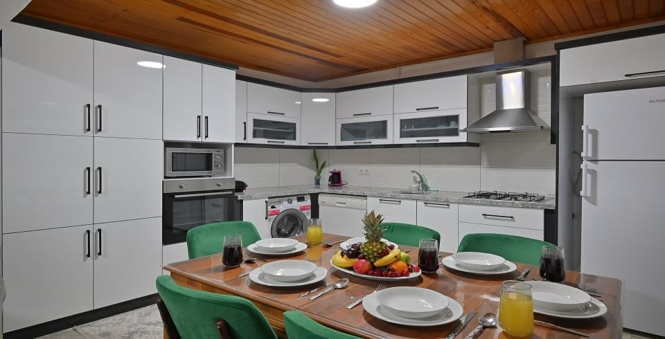 Mutfak: Açık planlı mutfak, 4 kişiye yetecek kadar mutfak malzemeleri, buzdolabı, fırın, ocak, mikrodalga fırın, bulaşık makinesi, çamaşır makinesi, tost makinesi, kettle ve çaydanlık bulunmaktadır..