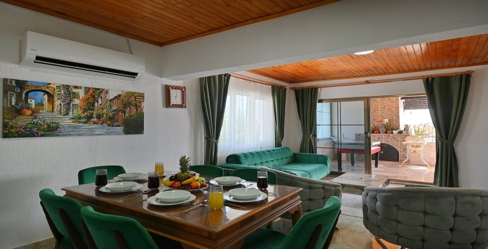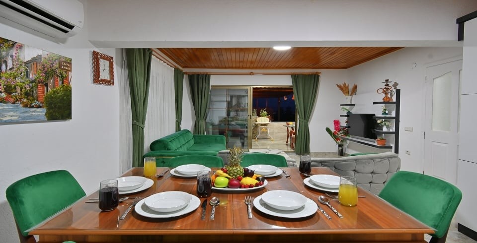 Salon: Özenle döşenmiş salon, modern koltuklar, 4 kişilik yemek masası, LCD TV ve klima, banyo, lavabo bulunmaktadır.