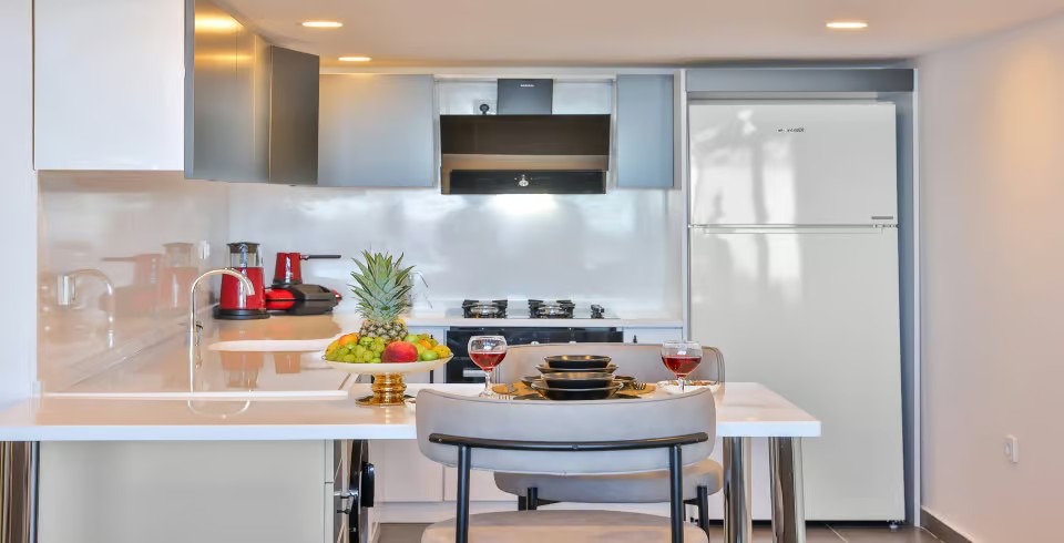 Mutfak : Modern Amerikan mutfak içerisinde buzdolabı, bulaşık makinası, fırın, ocak, mikrodalga fırın, kettle, tost makinası, yemek masası, yemek takımları, çatal ve bıçak takımları, tencere ve tava takımları, bardaklar bulunmaktadır.