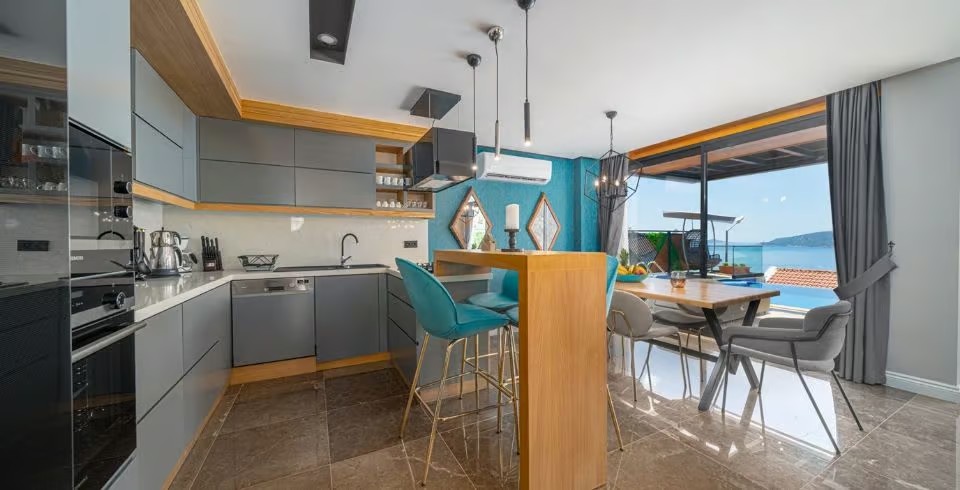 Mutfak: Amerikan ve Ankastre mutfak, Ekmek kızartma makinesi, Elektrikli su ısıtıcısı, 3 adet bar sandalyesi, 8 kişilik masa ve sandalyeler, Buzdolabı, çamaşır makinası, mutfak araç ve gereçlerini bulunmaktadır.