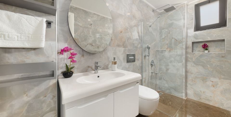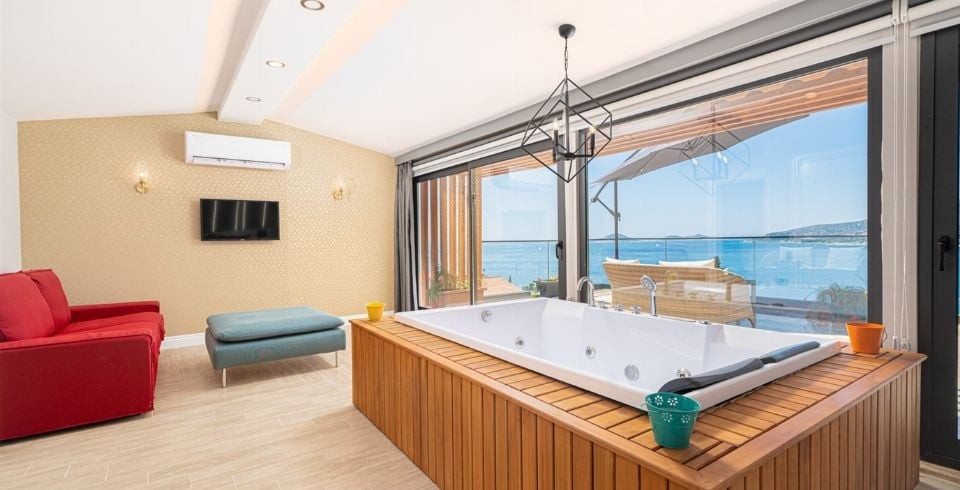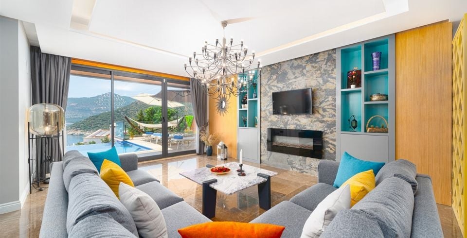 Salon: Geniş, ferah, modern tasarlanmış bir salon ve salonumuzda oturma grubu, TV, DVD, TV ünitesi ve ses sistemi, muhteşem deniz manzarasına sahip olan salonumuzdan havuz başına çıkış bulunmaktadır.