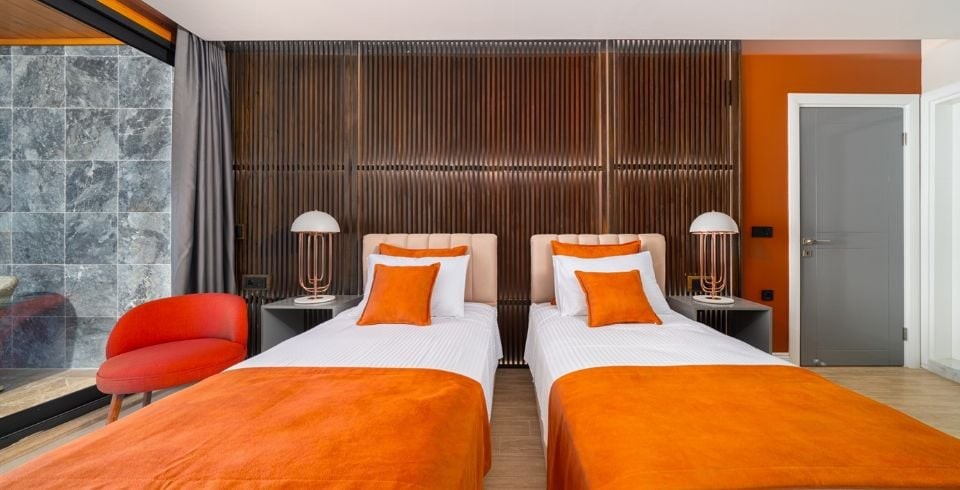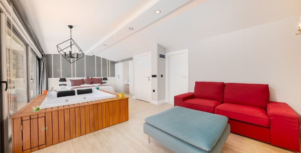 1. Yatak Odası : Çift kişilik yatak, Komodin, Klima, makyaj masası, jakuzi, banyo ve lavabo bulunmaktadır.