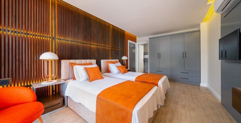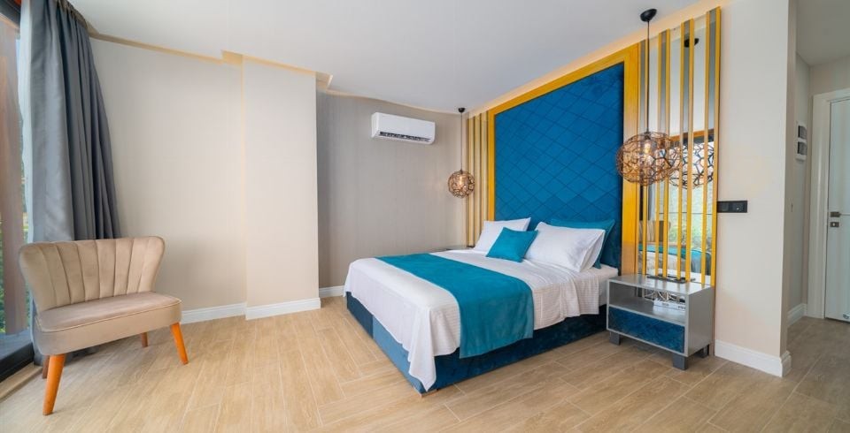 4. Yatak Odası : Çift kişilik yatak, komodin, klima, abajur, masa ve sandalye, banyo ve lavabo bulunmaktadır.