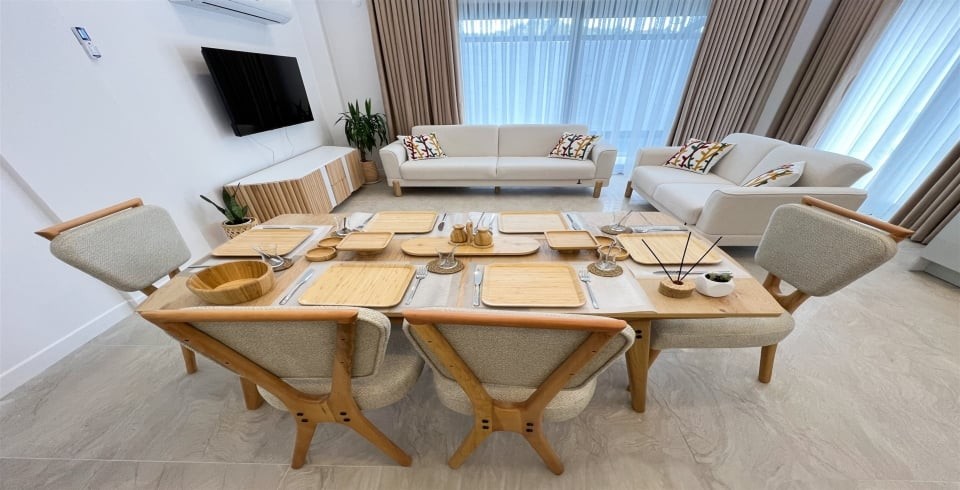 Mutfak :Tam donanımlı modern Amerikan mutfak içerisinde buzdolabı, bulaşık makinesi, fırın, ocak, tost makinası elektrikli su ısıtıcı, yemek masası, yemek takımları, çatal ve bıçak takımları, tencere ve tava takımları ve bardaklar bulunmaktadır.