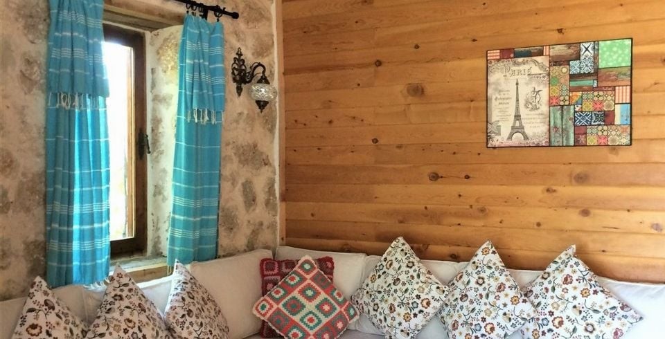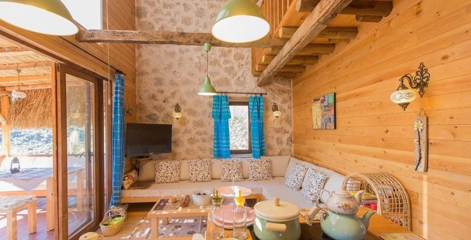 Salon : Badem Ev'e girdiğiniz anda sizi yüksek tavanlı, ahşap ve doğal taş dokunun sarmaladığı sıcak bir ortam bekliyor. Geniş cam yüzeylerden sizi kucaklayan Kaputaş Vadisi ve Akdeniz'in sonsuz ufku aydınlık ve ferah bir mekanın parçası olarak karşınıza çıkıyor. Geleneksel sedirli oturma odanızda en sevdiğiniz kitabınızı okuyabilir, televizyon seyredebilir ya da yalnızca yanı başınızda sizi saran huzur dolu doğanın keyfini çıkarabilirsiniz. Havuz terasının bir kademe üzerinde bulunan balkona çıkan salonda TV, sedir oturma grubu, sehpa bulunmaktadır. Salonumuz dağ manzaralıdır.