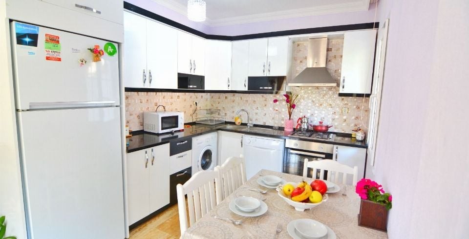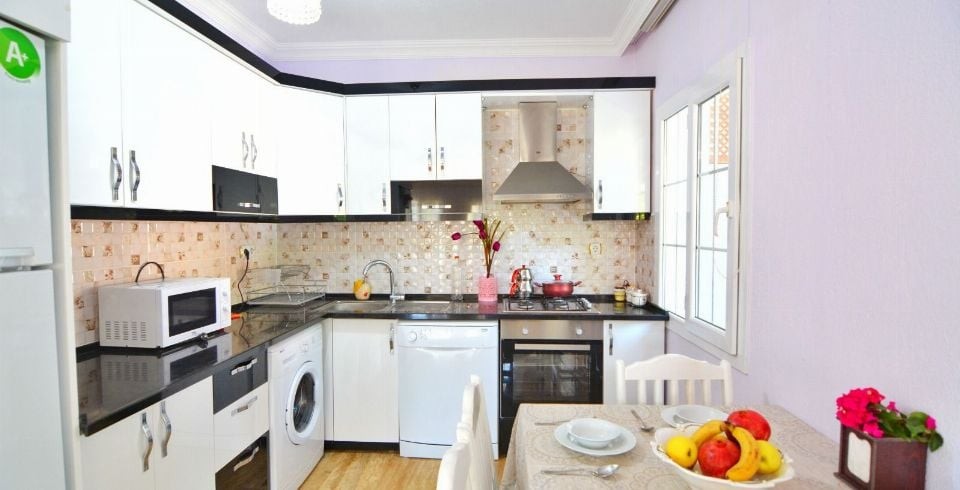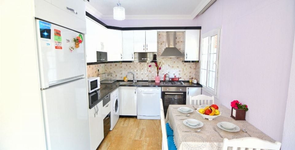 Mutfak : Villa Mor Amerikan mutfağında bulaşık makinası, buzdolabı, çamaşır makinesi, 4 kişilik yemek takımı, mikro dalga, ekmek kızartma makinası, kettle, yemek masası bulunmaktadır.
