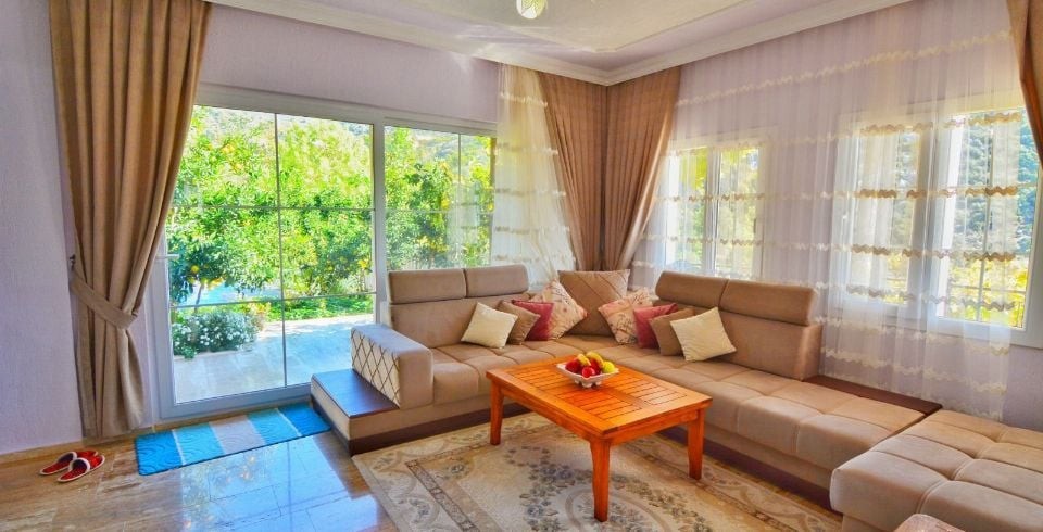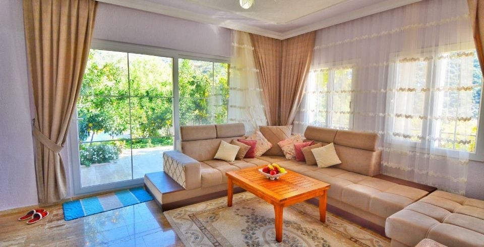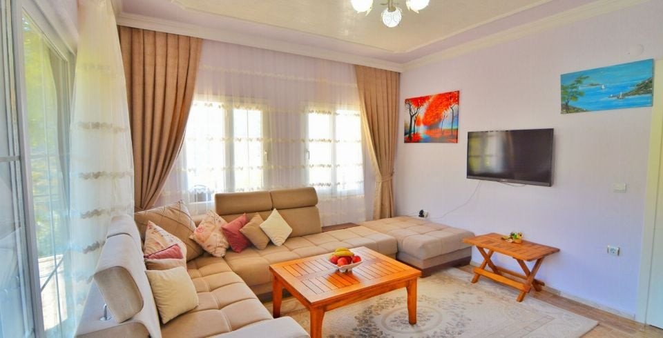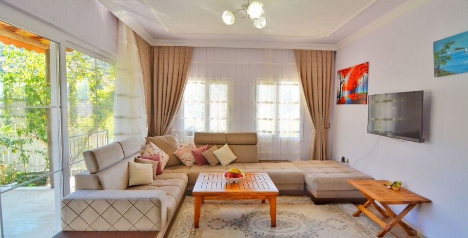 Salon : Kiralık villamızın Salonunda Oturma grubu, klima, uydu alıcı, WİFİ, TV, bulunmaktadır.