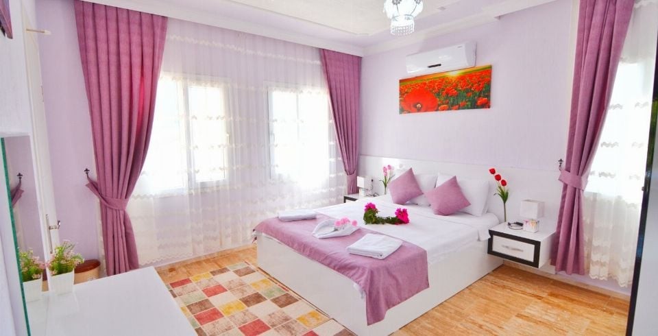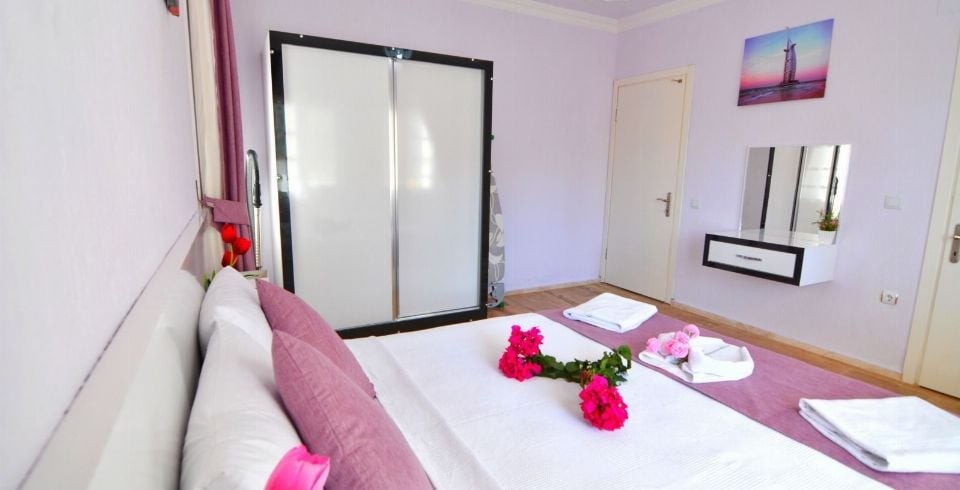 1. Yatak Odası : Çift kişilik yatak, klima, elbise dolabı, komodin, makyaj masası banyo ve tuvalet bulunmaktadır.